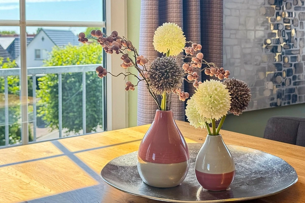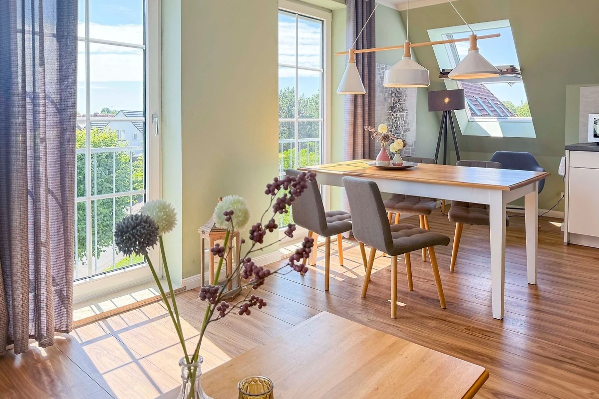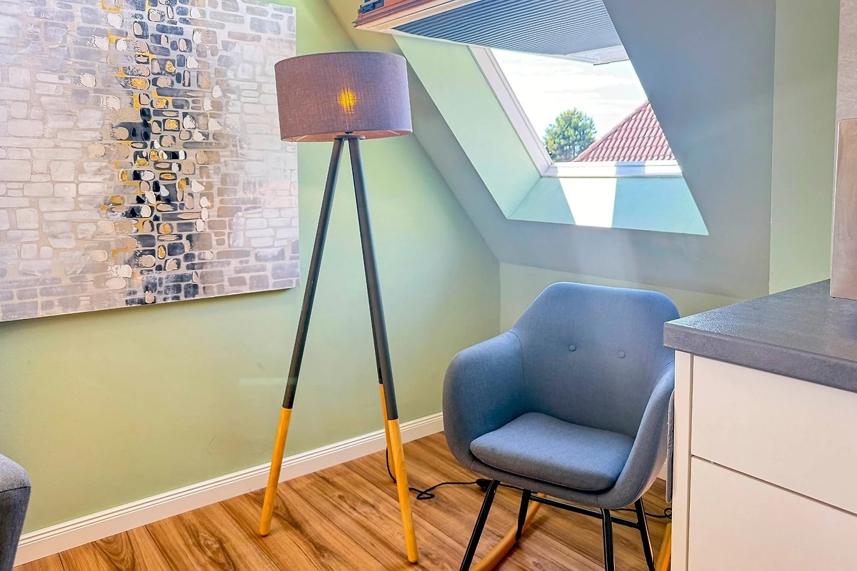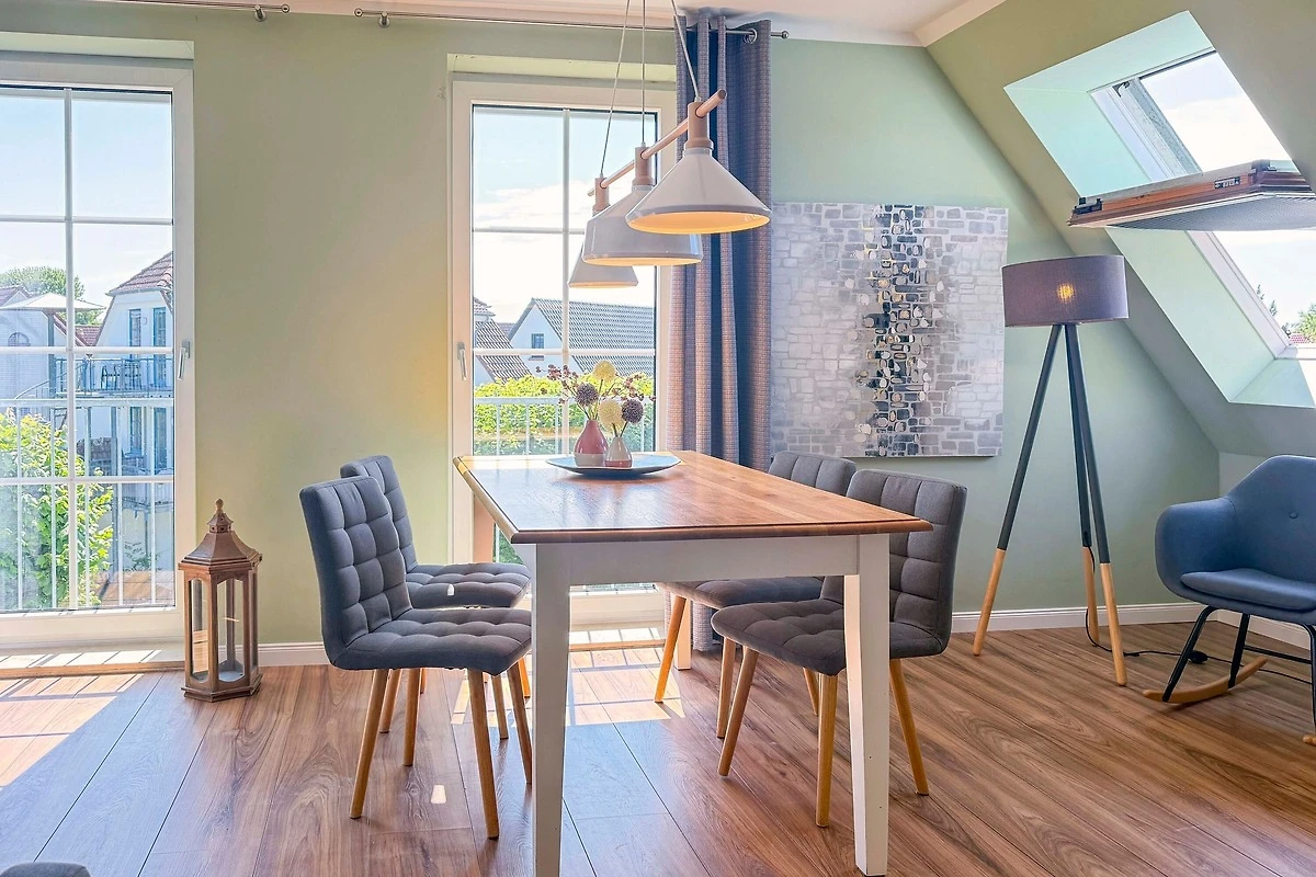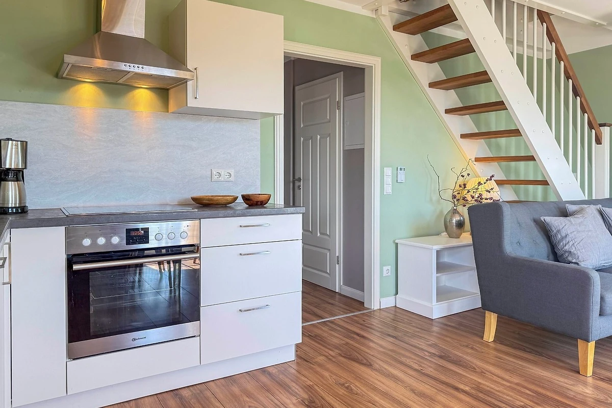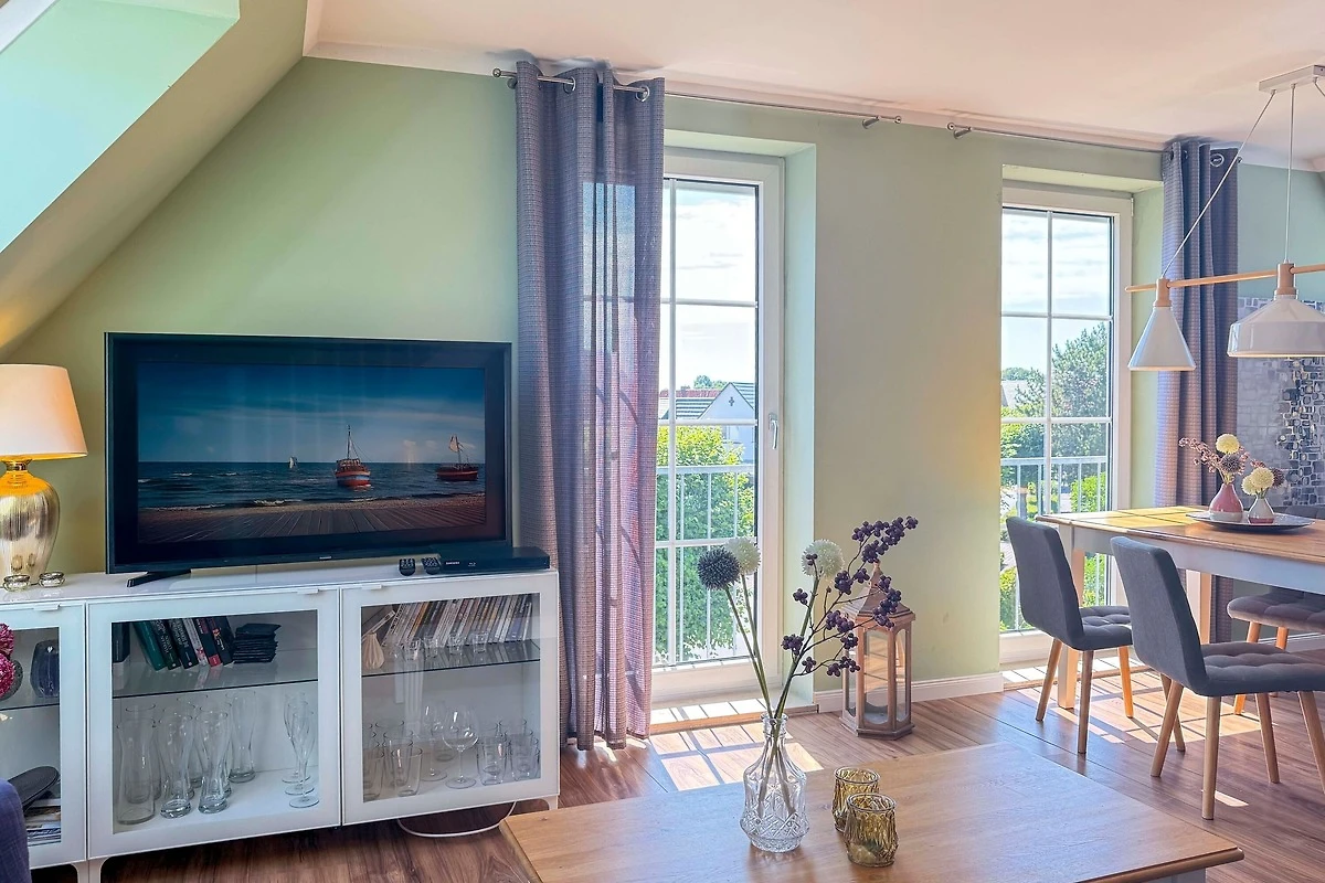 Die Ferienwohnung Meeresrauschen empfängt Sie mit einer harmonischen Mischung aus Komfort und Gemütlichkeit. Der lichtdurchflutete Wohnbereich lädt mit einem bequemen Sofa, Schaukelstuhl und Fernseher zu entspannten Stunden ein. Die offene Küche ist mit allen wichtigen Geräten ausgestattet, damit Sie auch im Urlaub nicht auf gutes Essen verzichten müssen. Am Esstisch lässt sich der Tag bei gemeinsamen Mahlzeiten wunderbar ausklingen.