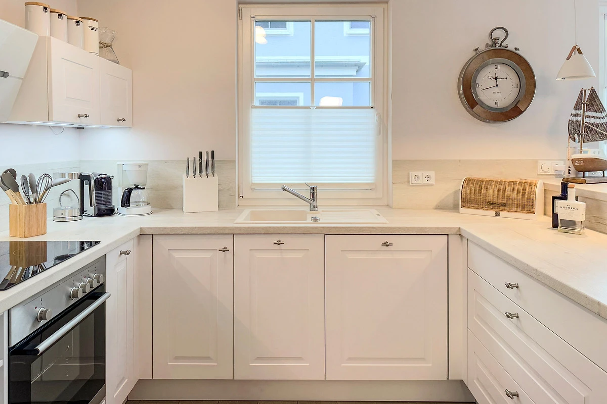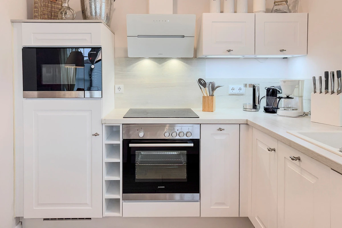 Moderne Küche ausgestattet mit Geschirrspüler, Kaffeevollautomat, Backofen und Mikrowelle