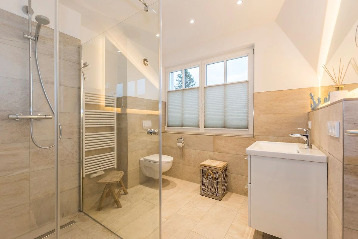Zwei stilvolle Badezimmer mit bodentiefen Duschen und Fussbodenheizung