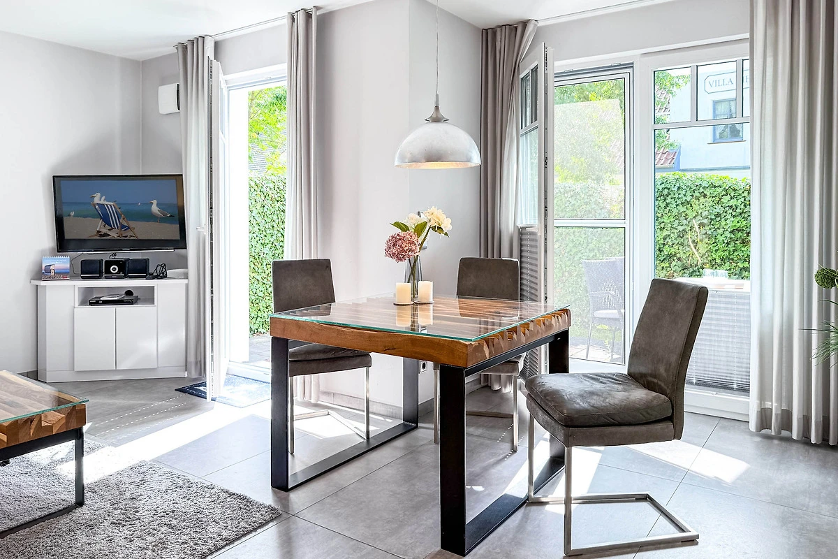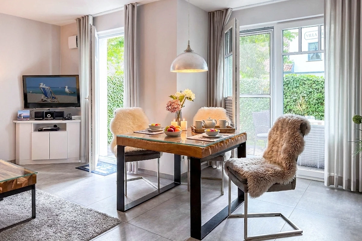 Im Erdgeschoss des Hauses Meerle erwartet Sie auf 46 m² eine liebevoll eingerichtete, voll ausgestattete Wohnung, die Ruhe, Komfort und maritimes Flair vereint. Dank der ruhigen Lage in einer Seitenstrasse und der Nähe zum Strand und Ortskern ist sie der perfekte Ort für Paare, kleine Familien oder Alleinreisende, die Erholung und Wohlbefinden suchen.