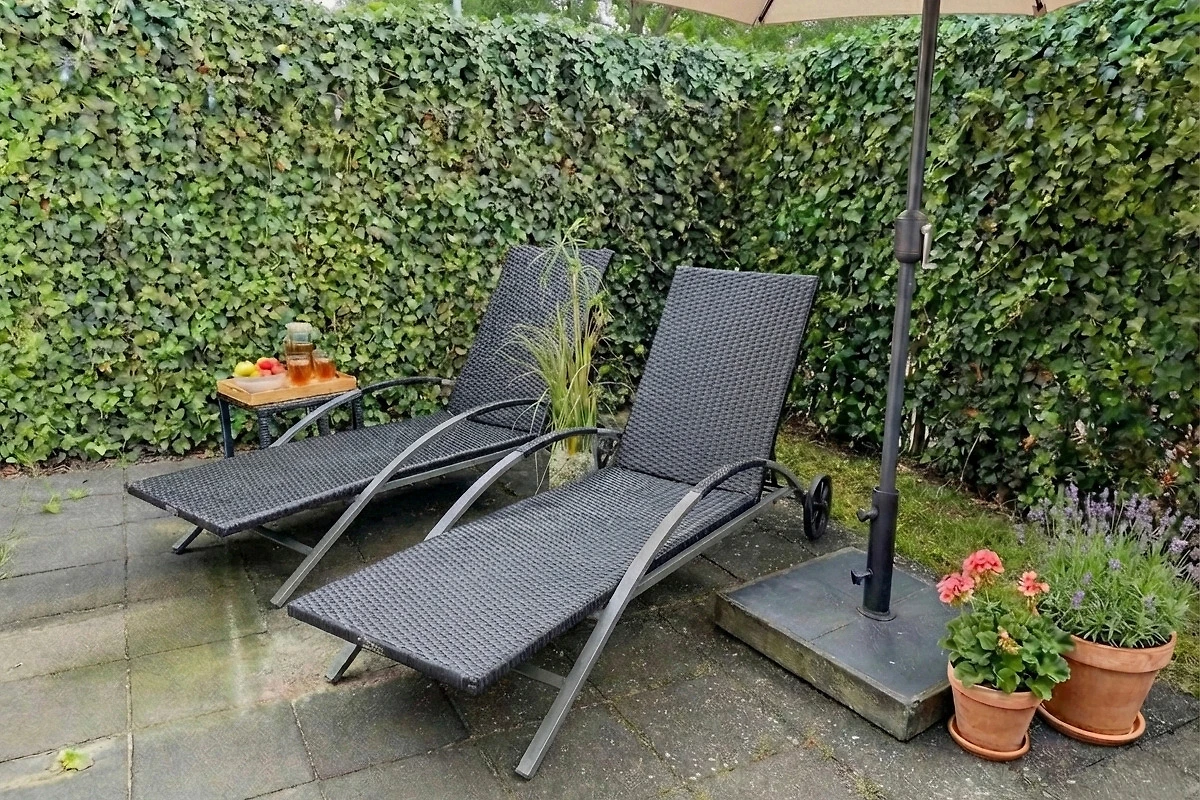 Terrasse: Sonnige Terrasse mit Gartenmöbeln, Sonnenschirm und Blick ins Grüne – ideal zum Frühstücken oder Entspannen