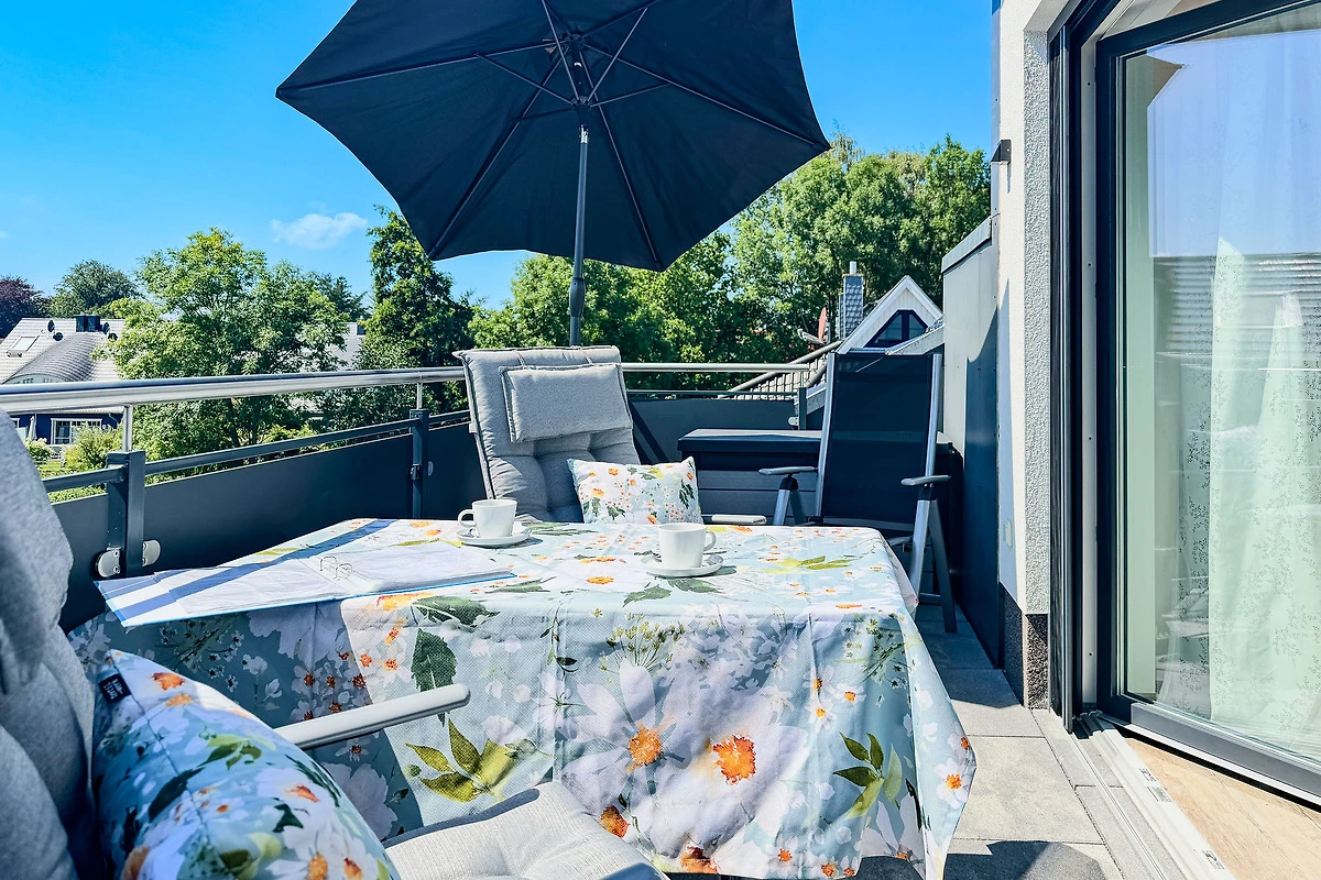 Privater Balkon: Möbliert mit Gartenmöbeln und Sonnenschirm – ideal für entspannte Stunden an der frischen Ostseeluft.