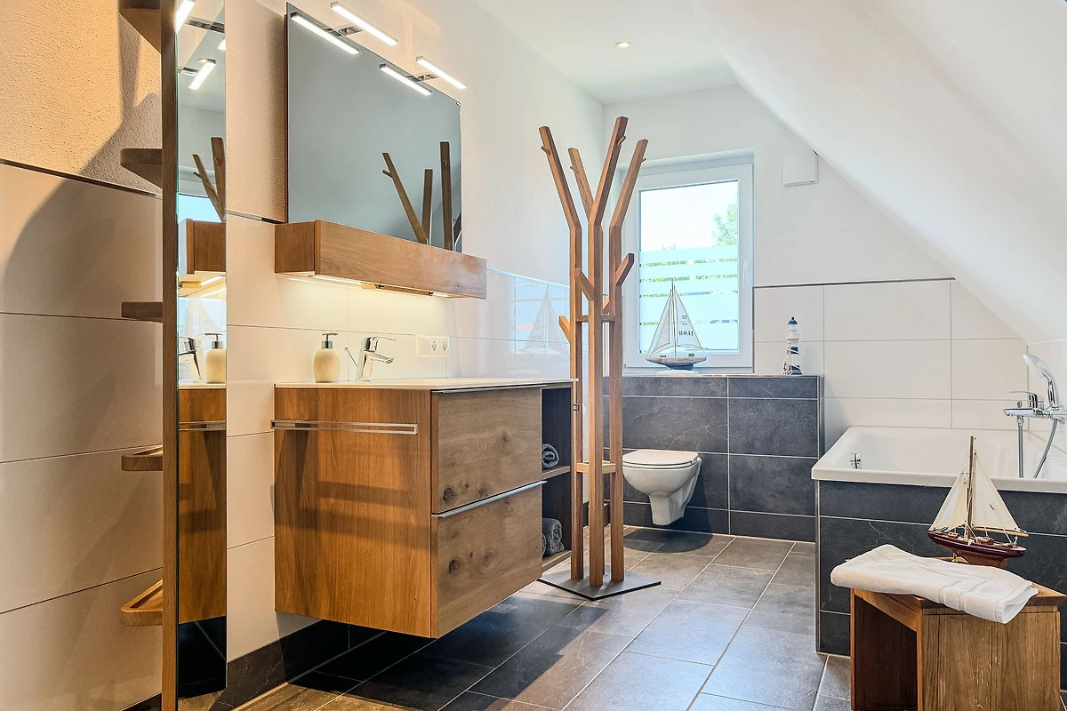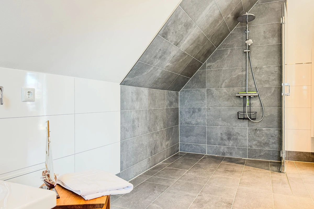 Modernes Badezimmer: Mit grosser Dusche und einladender Badewanne – perfekt zum Entspannen nach einem Strandtag.