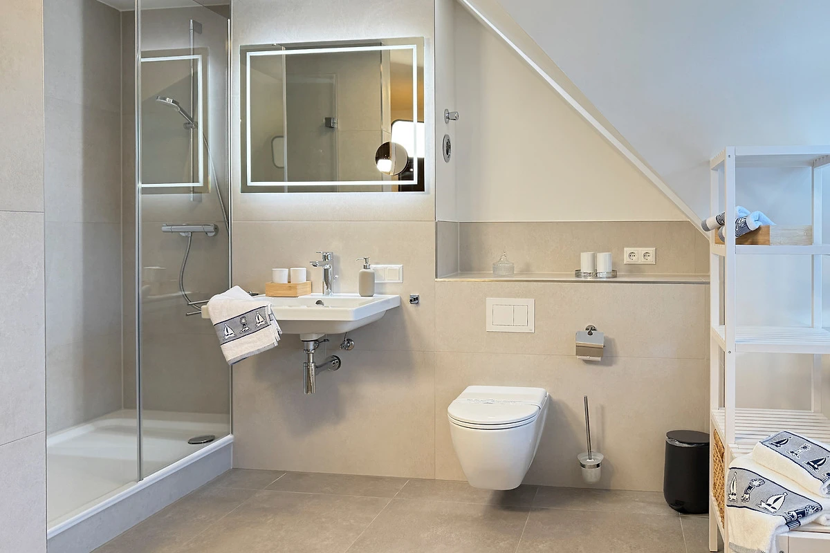 Badezimmer: Modernes Bad mit Dusche/WC, Handtuchtrockner und Haartrockner