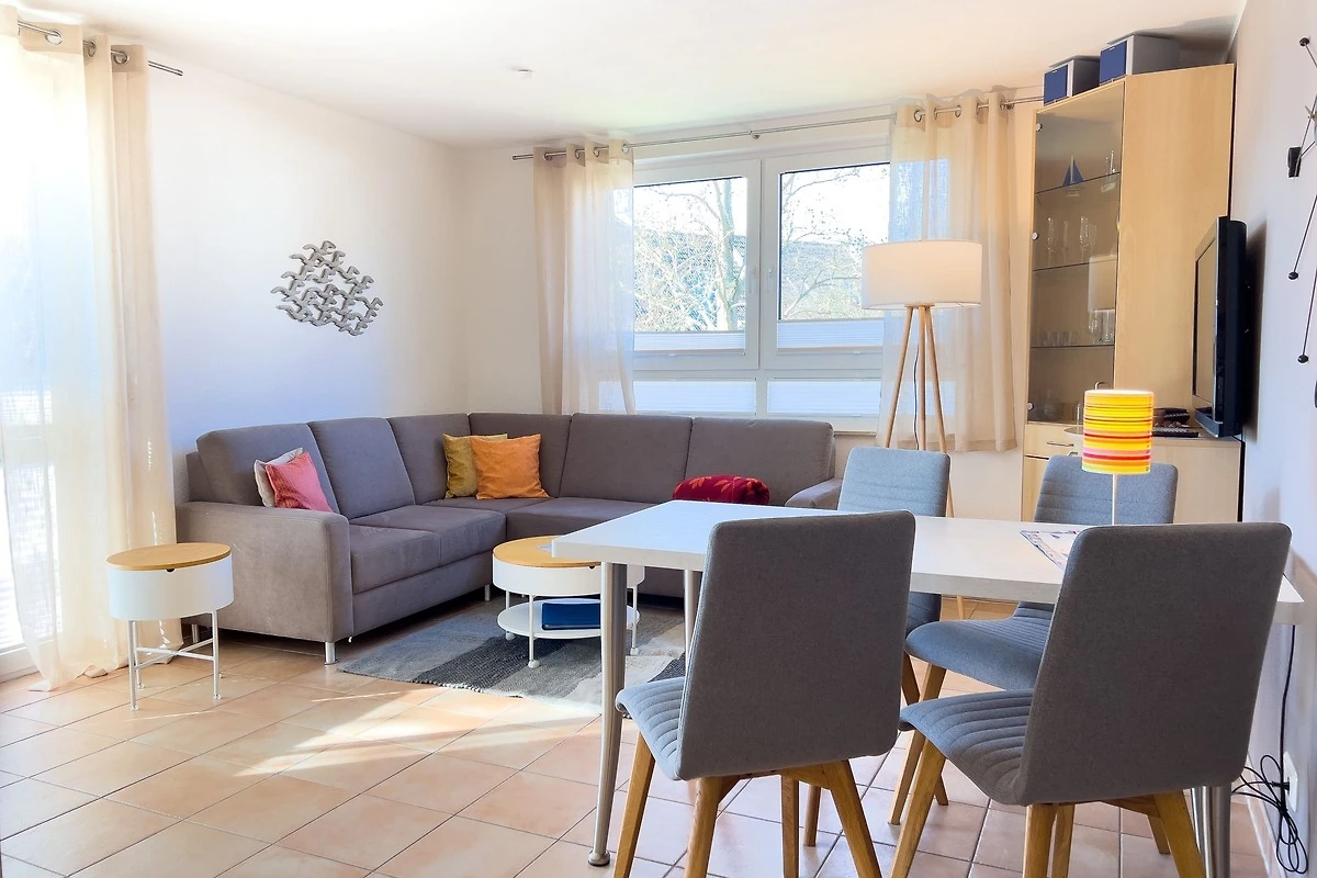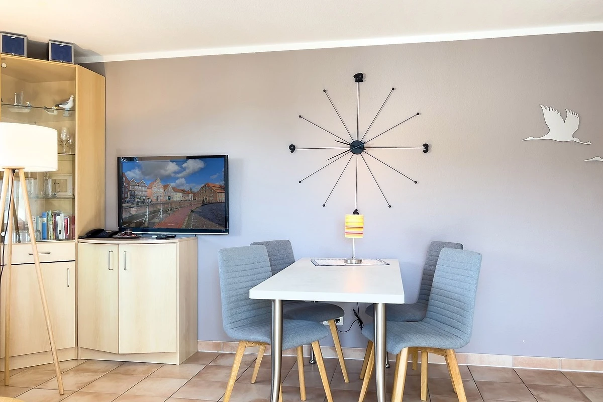 Geräumiger Wohn- und Essbereich: Mit bequemer Sofaecke, Flachbild-TV und einladendem Essplatz.