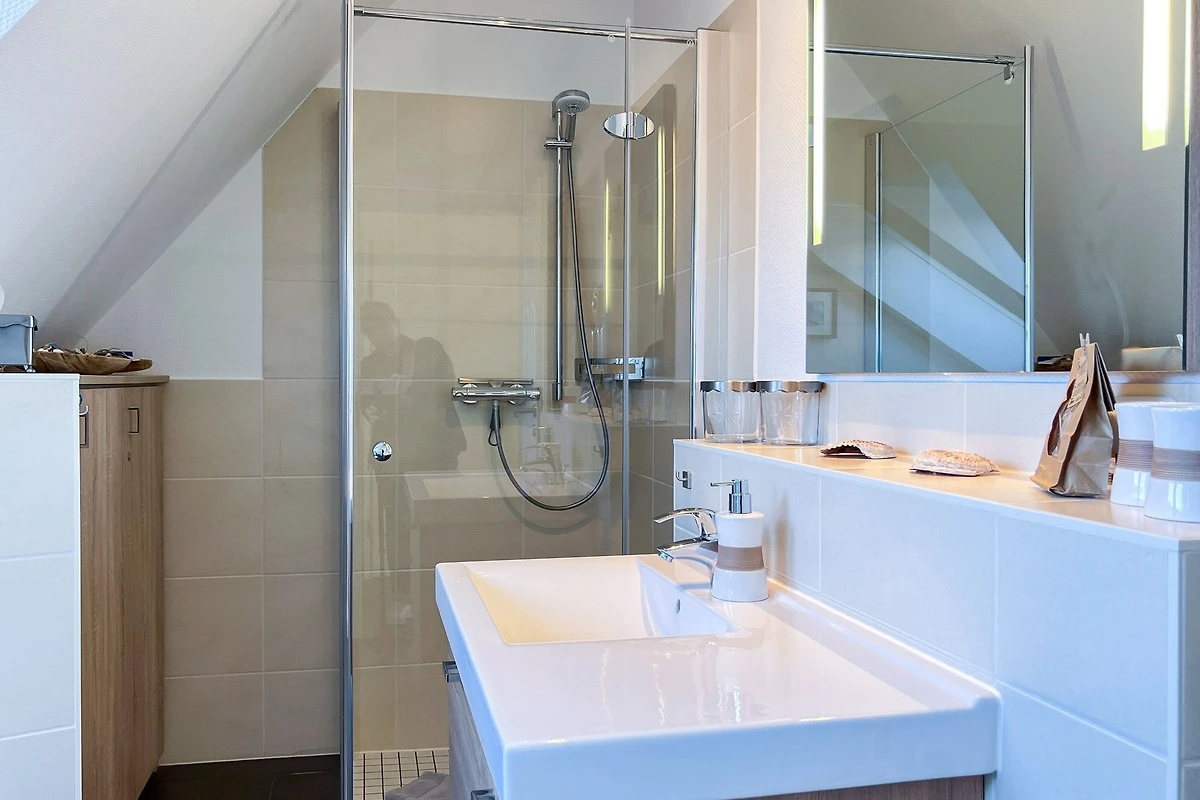 Modernes Badezimmer mit grosser Dusche und Fussbodenheizung
