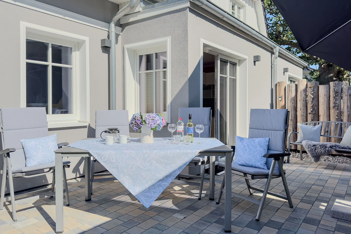 Private Terrasse mit Gartenmöbeln und Sonnenschirm – perfekt für entspannte Stunden im Freien