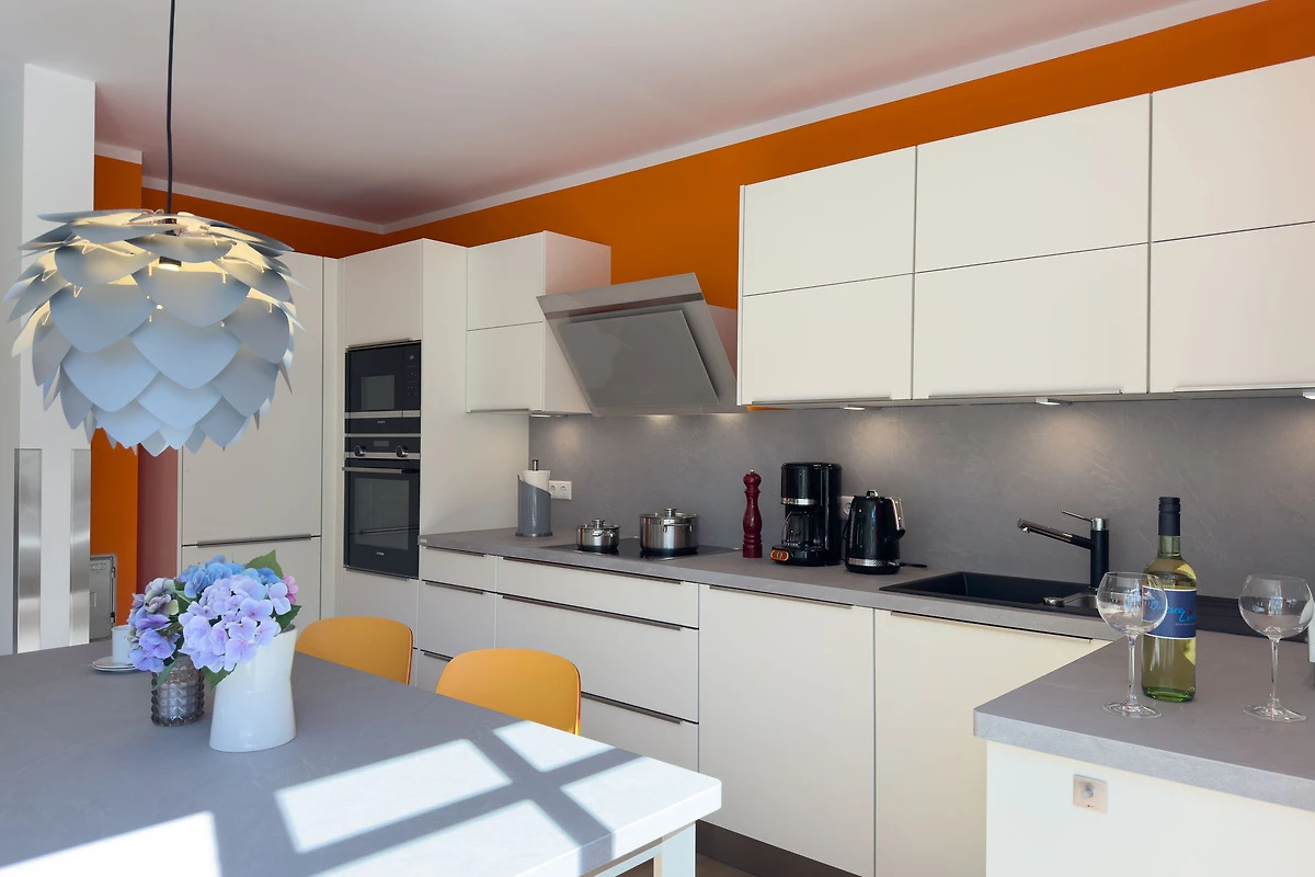 Voll ausgestattete Küche mit Geschirrspüler, Backofen, Kochfeld, Kühlschrank, Filterkaffeemaschine, Toaster und Wasserkocher