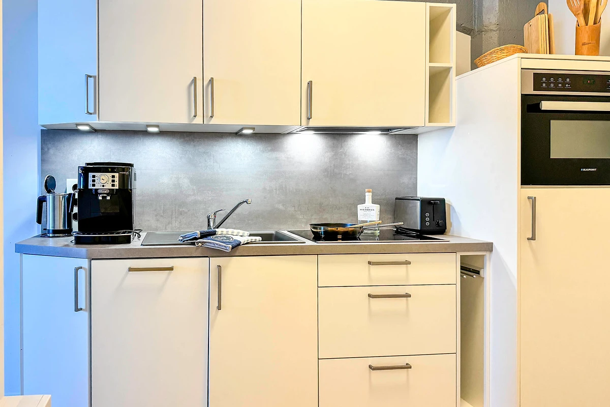Küche: Voll ausgestattete Küchenzeile mit Ceranfeld, Kühlschrank, Kaffeemaschine, Geschirr und Kochutensilien