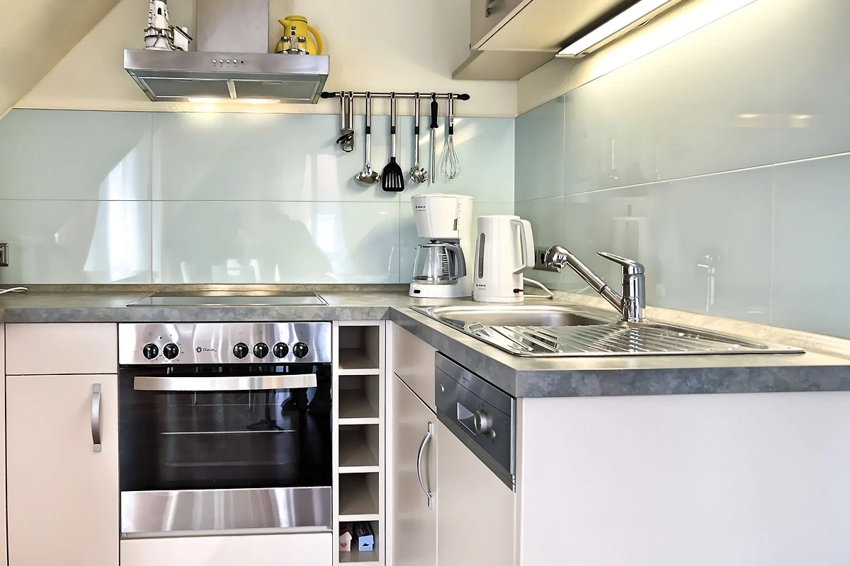 Voll ausgestattete Küche mit Kühlschrank, Ceranfeld, Mikrowelle, Kaffeemaschine, Toaster und Spülmaschine