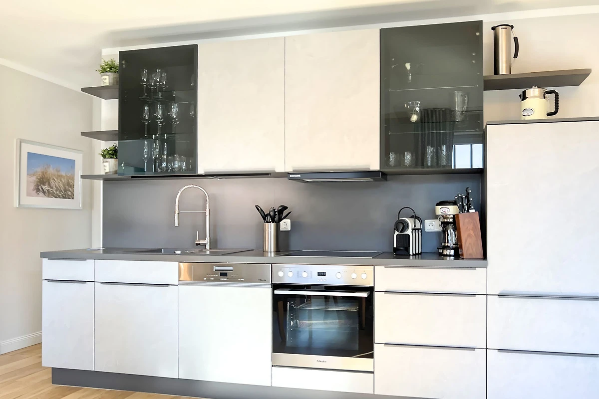 High-End Küche: Voll ausgestattet mit Miele-Geräten (Spülmaschine/Herd), Tchibo-Vollautomat für Kaffeespezialitäten sowie Filterkaffeemaschine, Toaster und Wasserkocher.