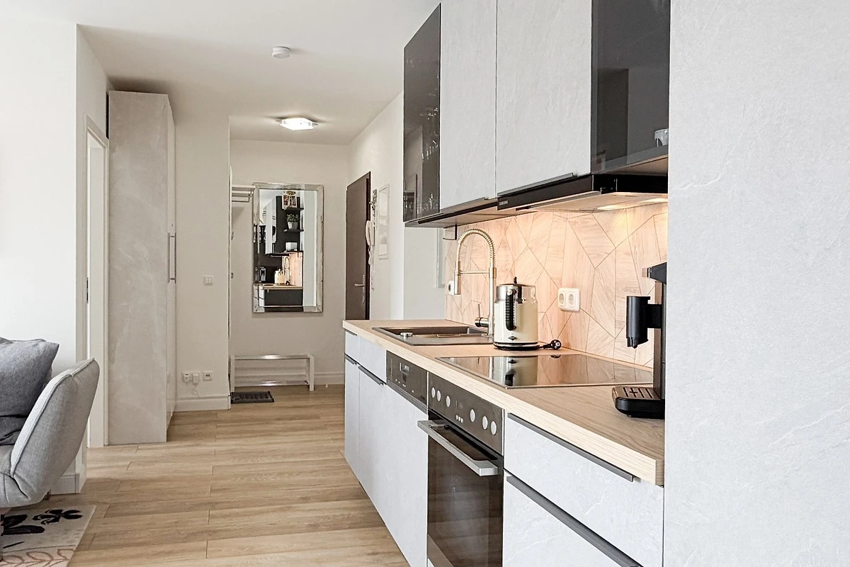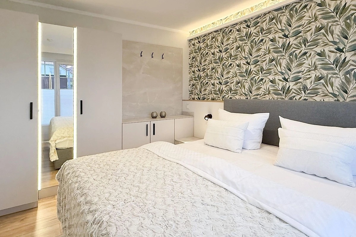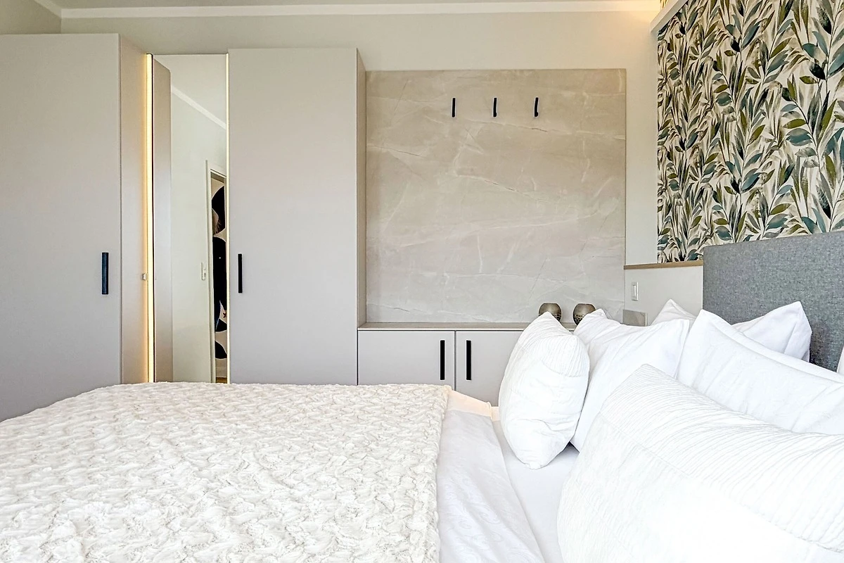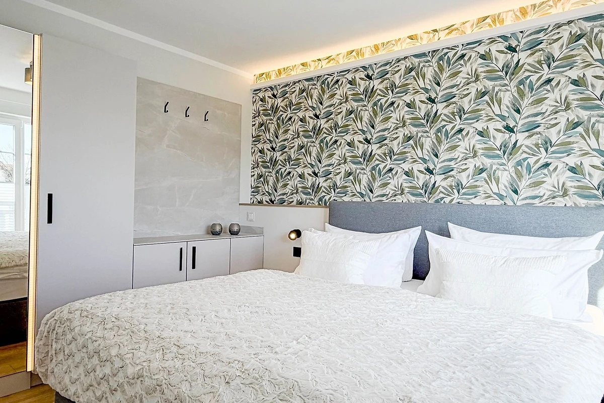 Die Ferienwohnung empfängt Sie mit einer modernen, lichtdurchfluteten Atmosphäre und künstlerischen Details wie der grossflächigen Wandgestaltung. Hier wurde an alles gedacht: Vom Ganzkörperspiegel mit Beleuchtung bis hin zur technischen Vollausstattung. Ob beim ausgiebigen Frühstück auf dem Sonnenbalkon oder nach einem langen Spaziergang am Meer – in der Villa Seeluft 3 finden Sie Ruhe und Stil in perfekter Harmonie.