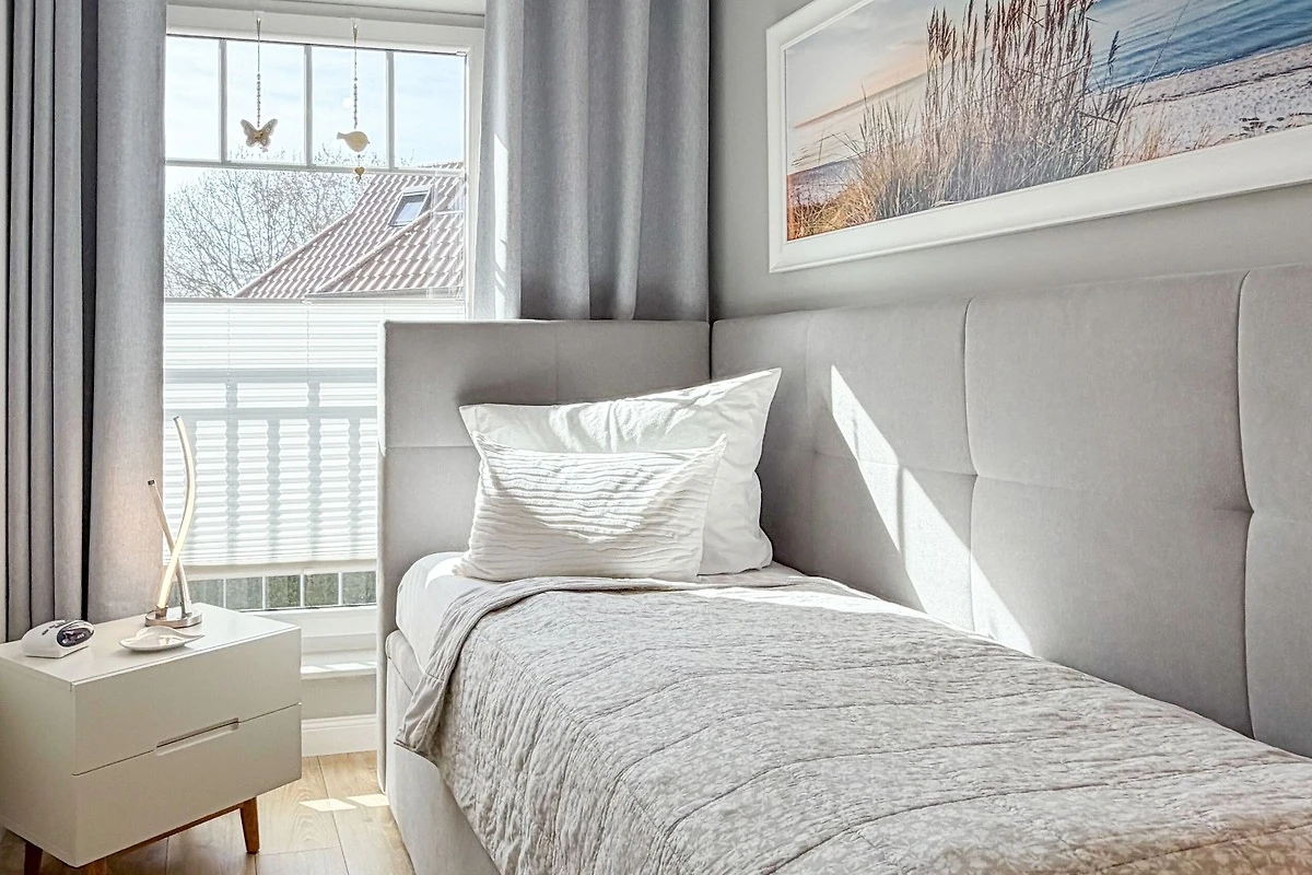 Komfortables Einzelzimmer: Ein zweites Schlafzimmer mit gemütlichem Boxspringbett (90 x 200 cm) – ideal für einen dritten Gast oder als ruhiger Rückzugsort.