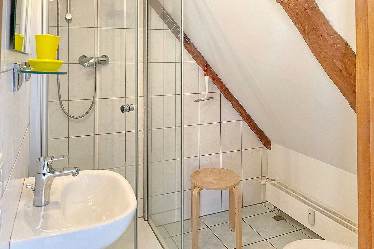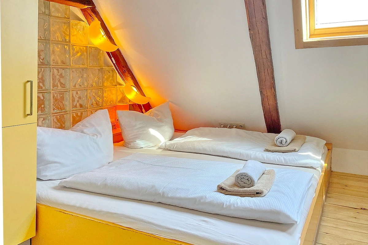 Die Wohnung 2 Monde befindet sich im Dachgeschoss. Sie gleicht einem Studioapartment mit Schlaf-, Wohn-, Küchenbereich. Das Bad ist separat mit Dusche und WC.