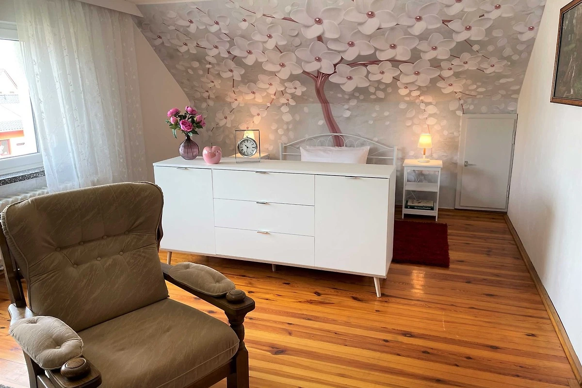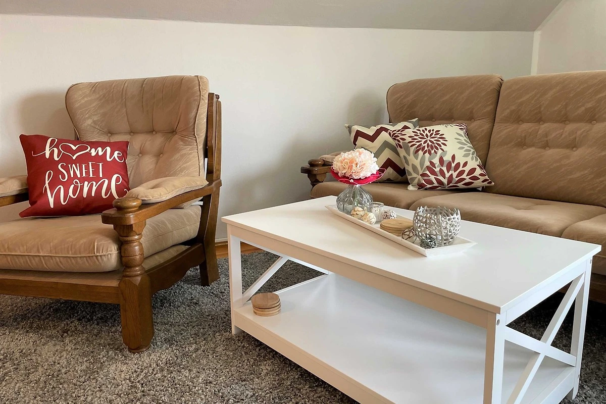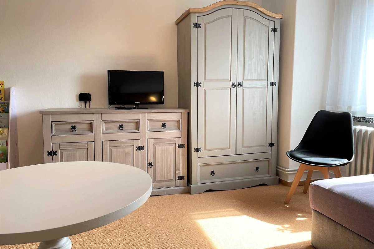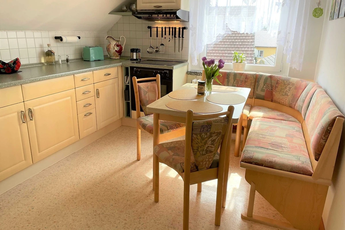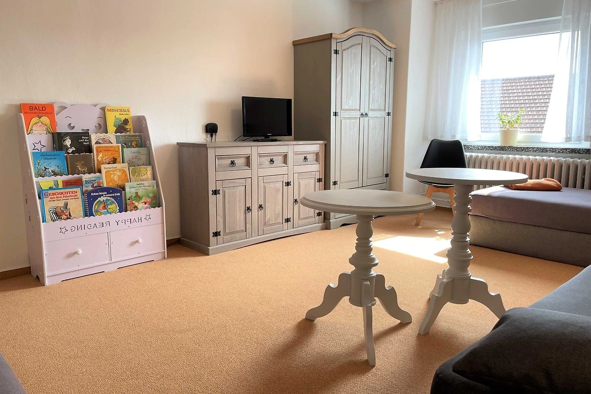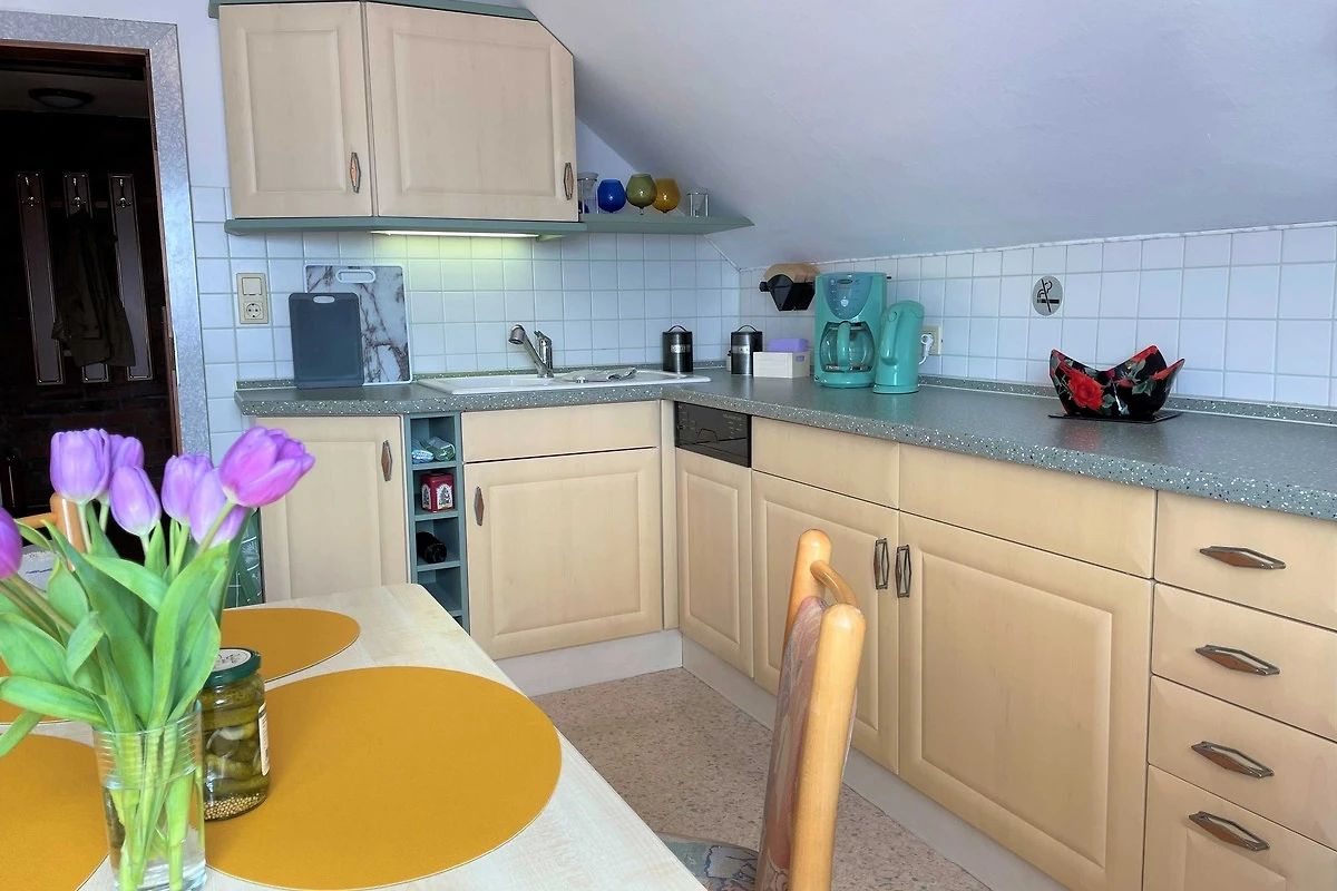 Über den Seiteneingang Veranda gelangen Sie zum Hauseingang. Sie gehen rechts die Treppe hoch zu Ihrer Ferienwohnung. Sie befindet sich im Obergeschoss. Der kleine Flur ist der Zugang zu allen Räumen. Somit ist jeder Wohnbereich separat. Im grosszügigen Wohn- und Schlafzimmer haben Sie viel Platz und Ruhe. Jeder findet ein Plätzchen zum Ausruhen auf dem Sofa und können Fernsehen auf dem Flachbild-TV. Im Schlafbereich befindet sich ein Doppelbett (1,80 m x 2,00 m ). Im Kinderzimmer dürfen sich die kleinen Mitreisenden sich so richtig wohl fühlen. Das Zimmer bietet viel Platz, mit Spielsachen, Büchern, einer Couch, Flachbild-TV und zahlreiche Kinderbücher. Die Küche ist vollkommen ausgestattet mit allen Utensilien und Geräten, die Sie zum Kochen und Essen zubereiten brauchen. In der Sitzecke können Sie alle Mahlzeiten einnehmen. Das Bad bietet Ihnen eine Badewanne, Dusche und WC.