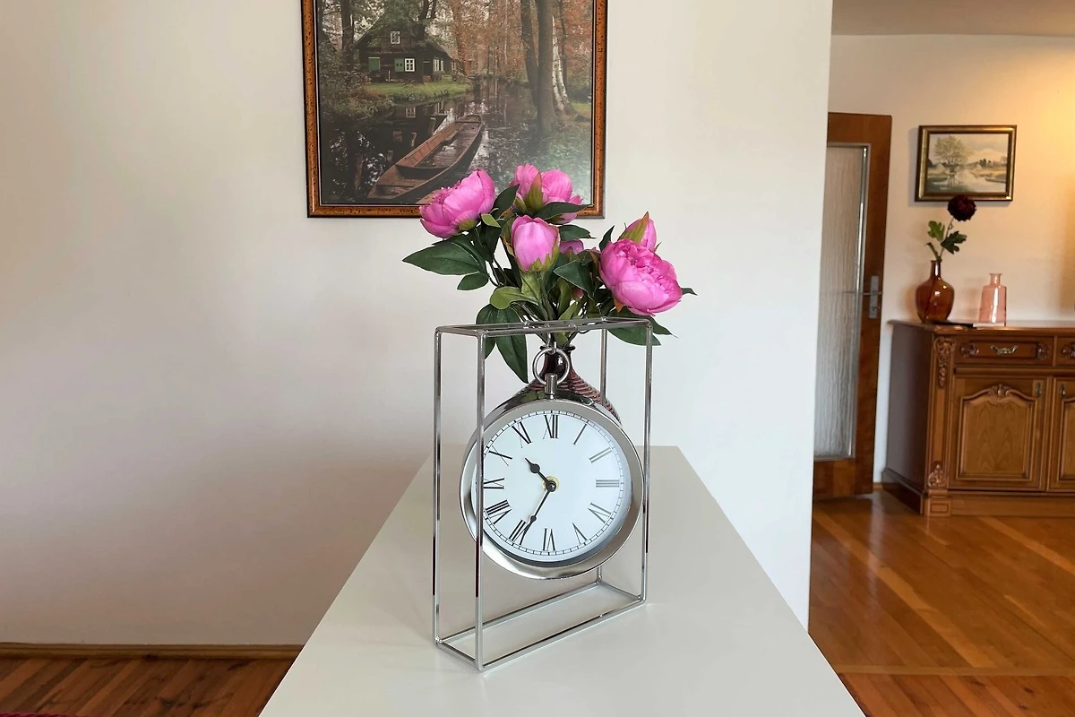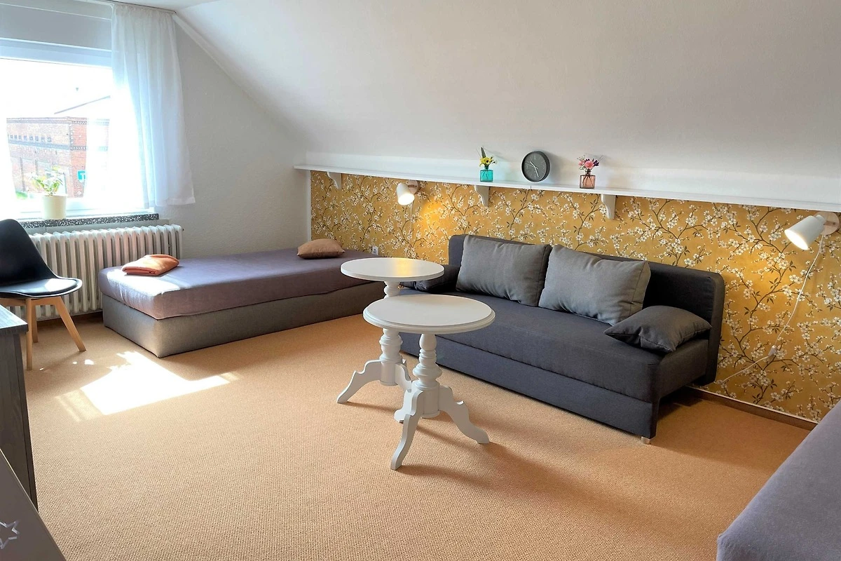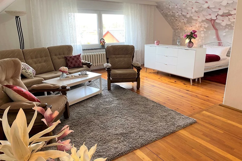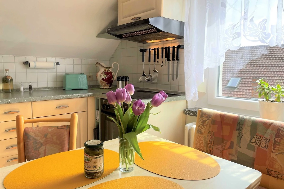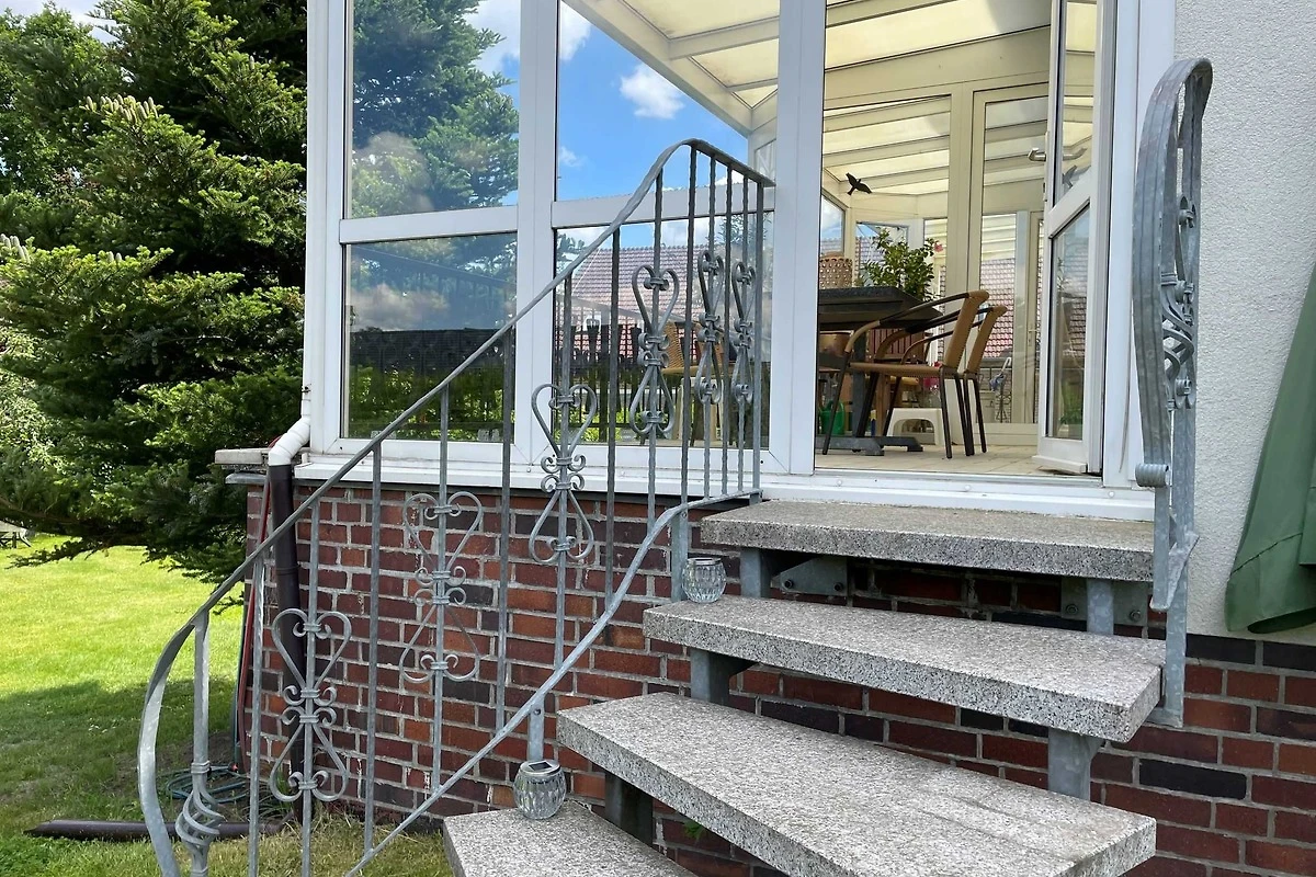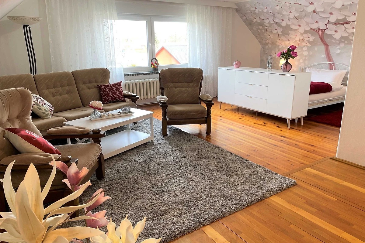 Über den Seiteneingang Veranda gelangen Sie zum Hauseingang. Sie gehen rechts die Treppe hoch zu Ihrer Ferienwohnung. Sie befindet sich im Obergeschoss. Der kleine Flur ist der Zugang zu allen Räumen. Somit ist jeder Wohnbereich separat. Im grosszügigen Wohn- und Schlafzimmer haben Sie viel Platz und Ruhe. Jeder findet ein Plätzchen zum Ausruhen auf dem Sofa und können Fernsehen auf dem Flachbild-TV. Im Schlafbereich befindet sich ein Doppelbett (1,80 m x 2,00 m ). Im Kinderzimmer dürfen sich die kleinen Mitreisenden sich so richtig wohl fühlen. Das Zimmer bietet viel Platz, mit Spielsachen, Büchern, einer Couch, Flachbild-TV und zahlreiche Kinderbücher. Die Küche ist vollkommen ausgestattet mit allen Utensilien und Geräten, die Sie zum Kochen und Essen zubereiten brauchen. In der Sitzecke können Sie alle Mahlzeiten einnehmen. Das Bad bietet Ihnen eine Badewanne, Dusche und WC.