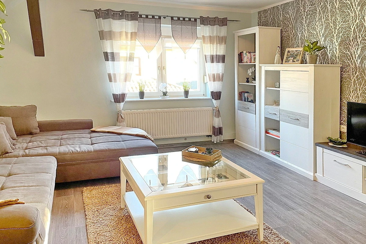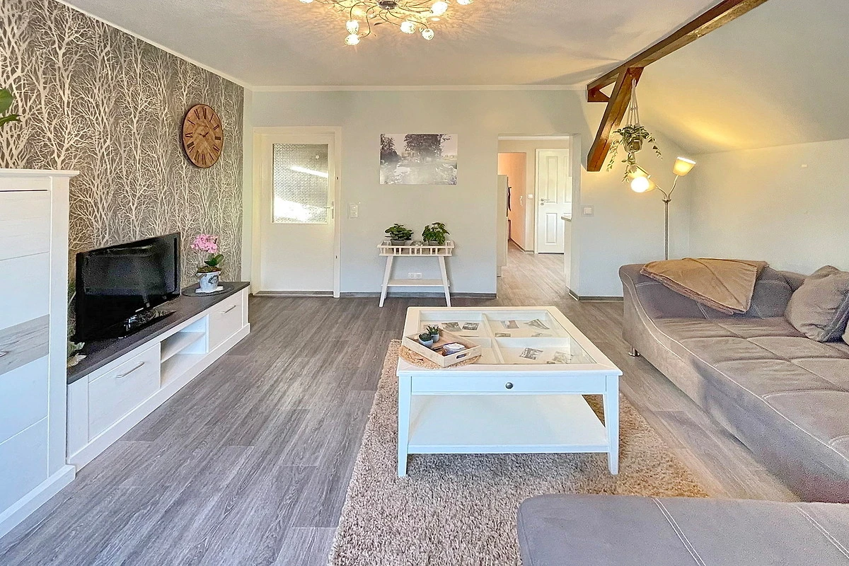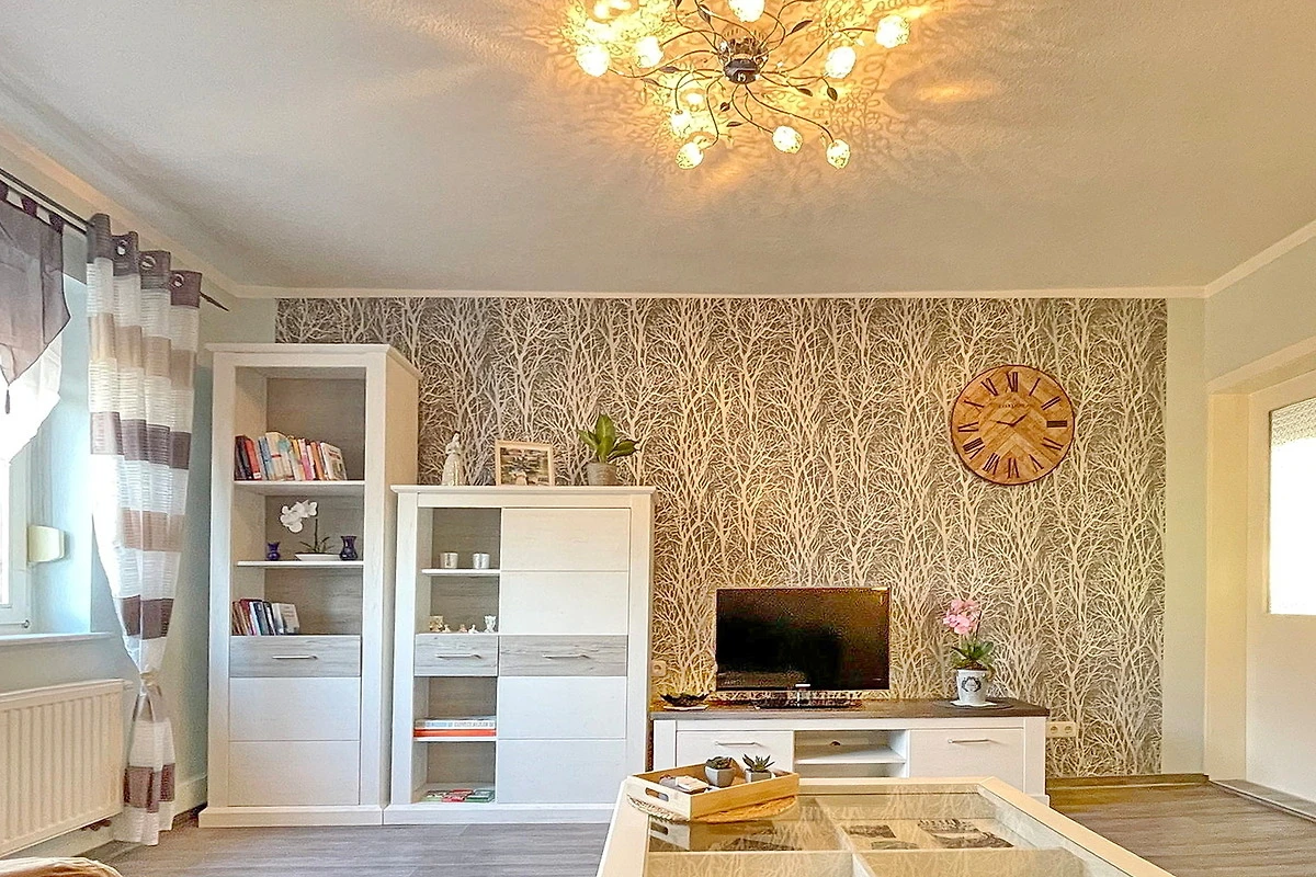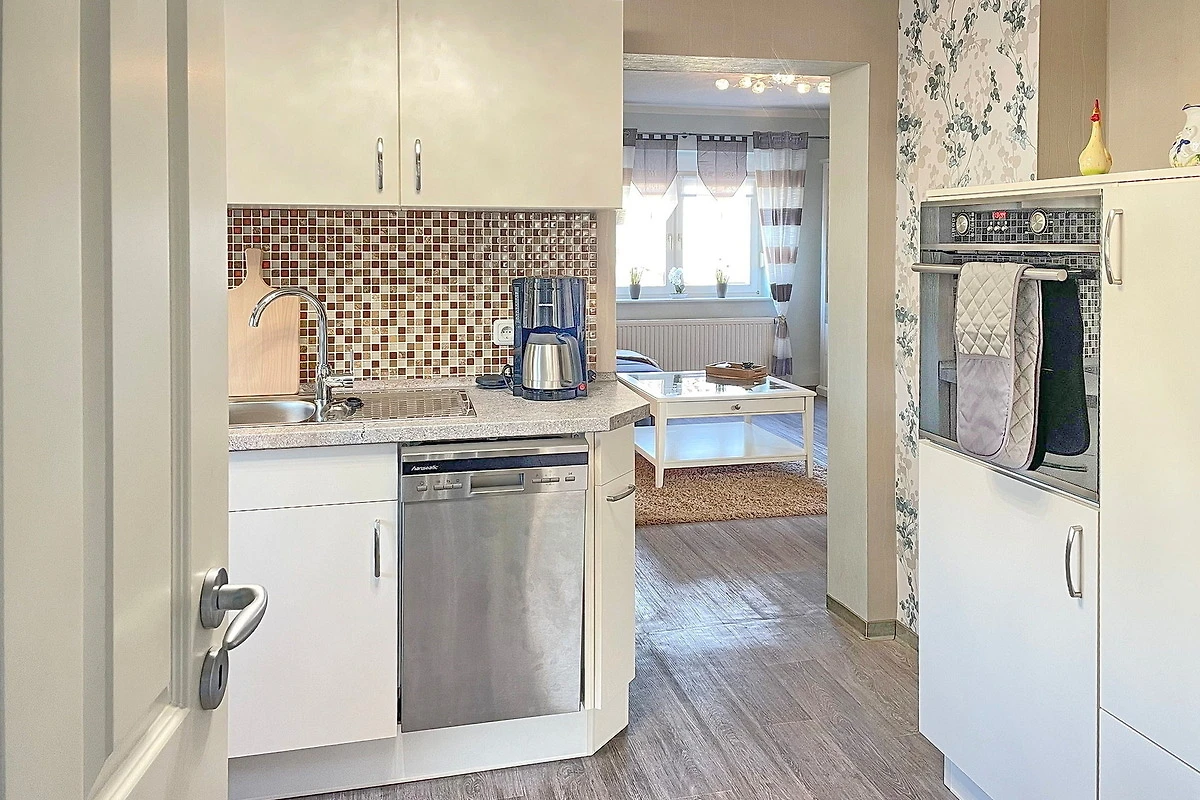 Die ca. 61 qm grosse Vier-Raum-Wohnung ist ideal ausgestattet für eine vierköpfige Familie. In der voll ausgestatteten Küche befindet sich ein Esstisch der ausreichend Platz für 4 Personen bietet. Diese moderne Einbauküche, bietet Ihnen ein 4 Platten Cerankochfeld, ein Backofen, ein Geschirrspüler, ein Kühlschrank mit Gefrierfach, ein Wasserkocher, ein Toaster und eine Kaffeemaschine. Von dort aus gelangen Sie ins Schlafzimmer mit einem grosszügigen Doppelbett (1,80 x 2,00 m), einem grossen Kleiderschrank, einer Kommode mit Flachbild-TV. Das Kinderzimmer ist diesem Raum angeschlossen mit einer Trennwand und Tür. Es hat zwei extra stehende Einzelbetten und genug Stauraum für Spielsachen. Das Wohnzimmer der Ferienwohnung ist mit einer XXL gemütlichen Couch ausgestattet, es ist sehr geräumig. Zur Unterhaltung bietet das Wohnzimmer einen Flachbild TV. Im Badezimmer befinden sich eine Dusche, ein WC, Waschtisch mit einem beleuchteten Spiegel und einer Waschmaschine zur kostenfreien Nutzung. Des Weiteren sind ein Föhn sowie Handtuchtrockner vorhanden.