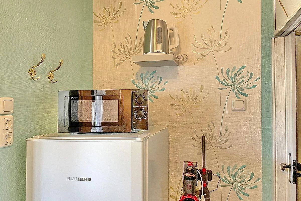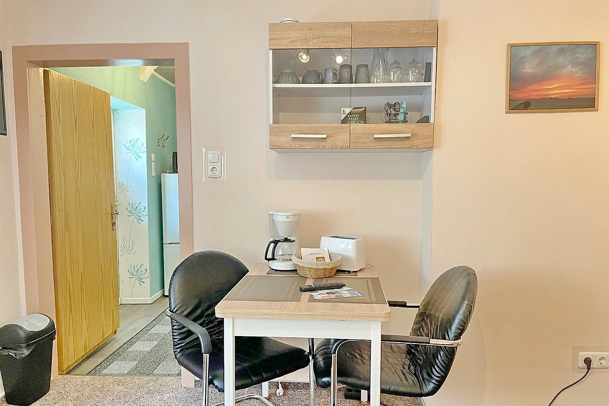 Das Zimmer ist mit einem Kühlschrank, Gefrierfach, Wasserkocher und Mikrowelle ausgestattet. Am kleinen Esstisch können tägliche Mahlzeiten eingenommen werden, so wie Brotmahlzeiten oder ähnlich schnell zubereitete Gerichte. Der Kleiderschrank bietet ausreichend Stauraum für Kleidung, auch für längere Aufenthalte.