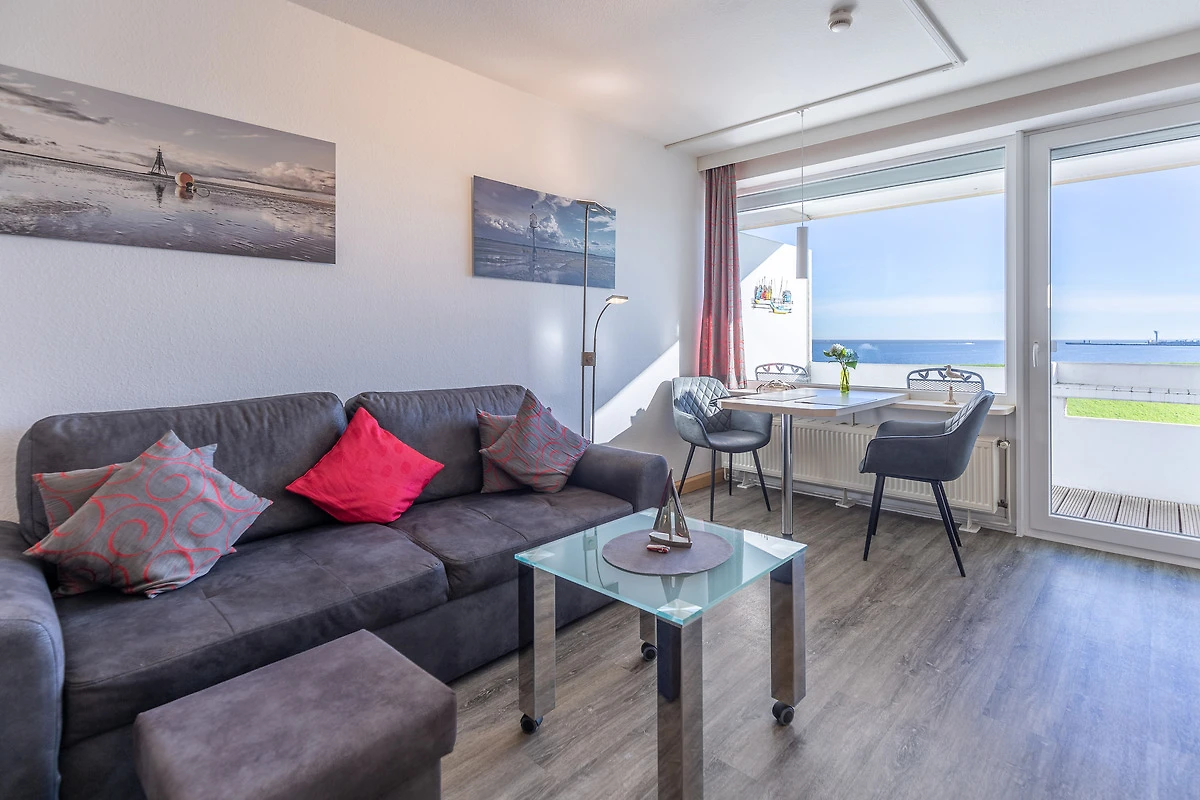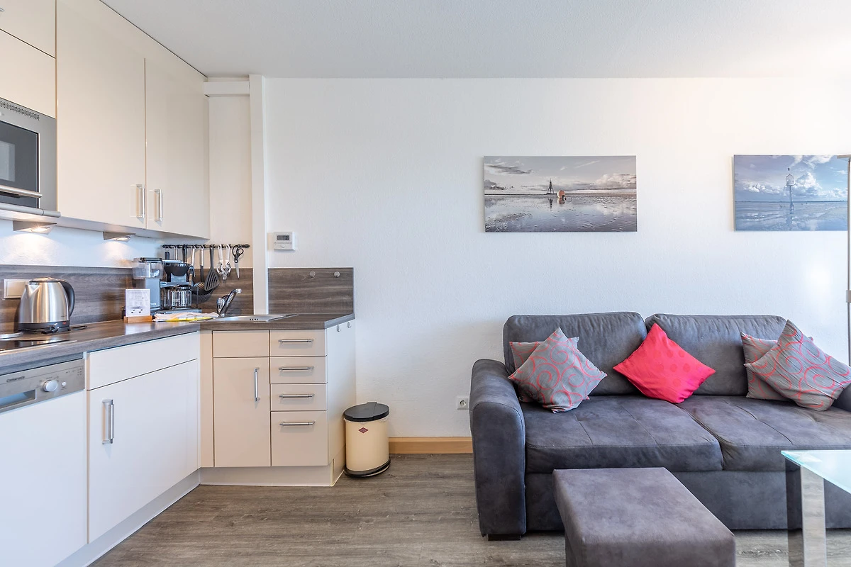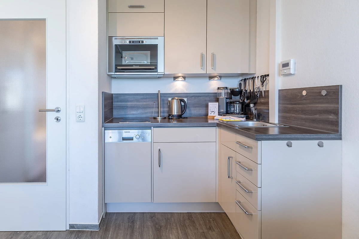 Vom Esstisch am Fenster geniessen Sie schon beim allmorgendlichen Frühstück einen traumhaften Ausblick auf die Elbe und den Schifffahrtsweg. Die 35 m² Ferienwohnung bietet einen abwechslungsreichen Ausblick auf die vorbeifahrenden Ozeanriesen und lässt keine Langeweile aufkommen. Ferienwohnung Nautic 308 ist ideal für eine Belegung mit 2 Personen geeignet. Im Wohnbereich ist eine kleine Küche mit Geschirrspüler und Mikrowelle integriert.
