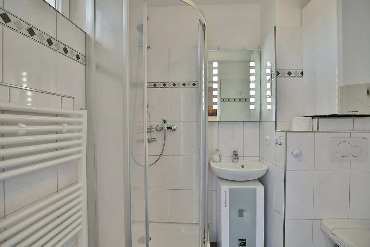 Das moderne Bad mit Dusche und WC verfügt über ein Fenster zum Belüften. Der möblierten Balkon mit Bangkirai Holzboden bietet ein wohnliches Ambiente und einen fantastischen Meerblick. Zu Ferienwohnung 308 gehört eine Garage. Das Haus Nautic liegt in der schönsten Lage Cuxhavens. Fuss- und Radwege beginnen direkt vor der Haustür. Sollte das Wetter einmal nicht mitspielen, so können Sie das hauseigene Schwimmbad sowie die Sauna kostenlos nutzen.