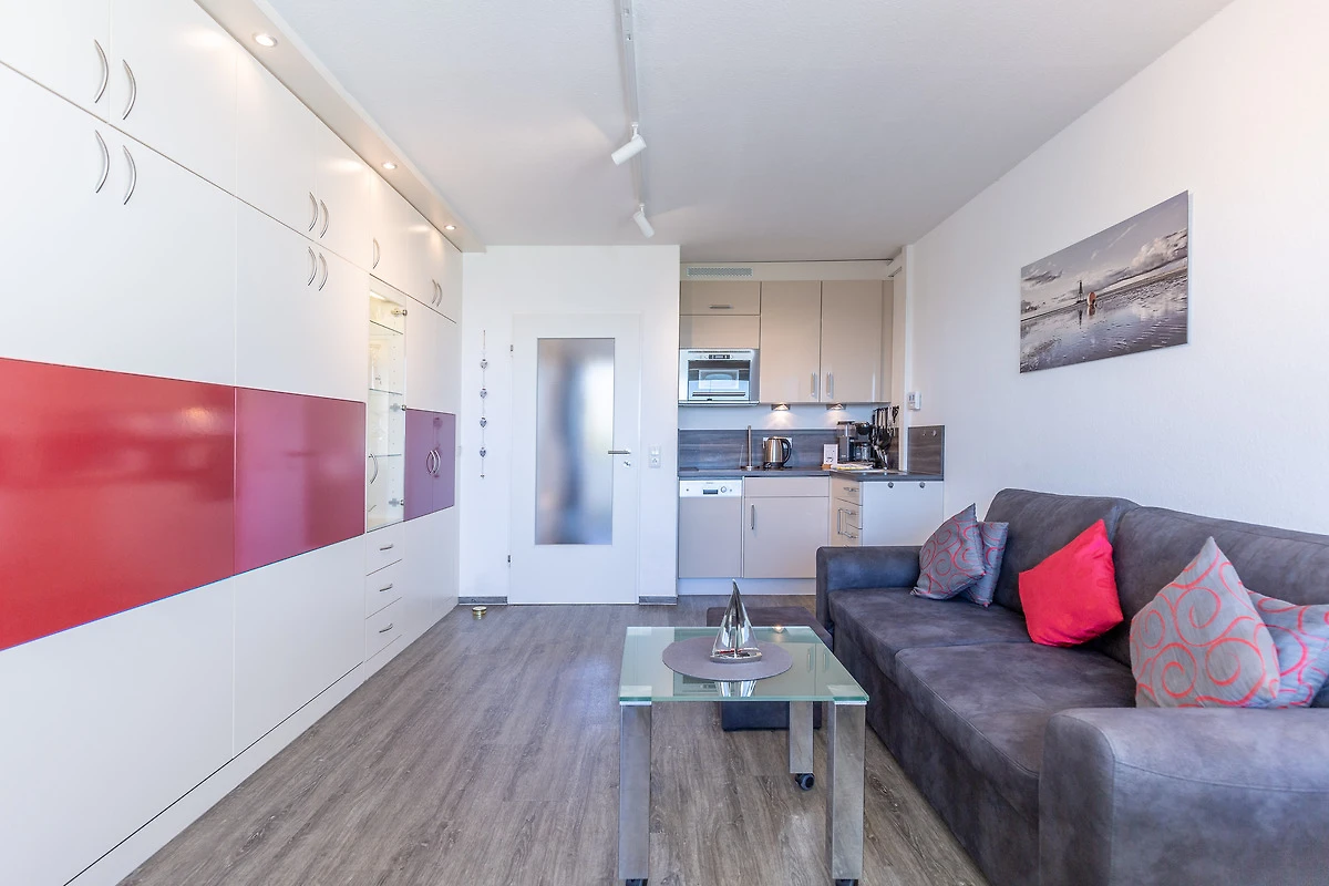 Die hochwertigen Schrankbetten im kombinierten Wohn- und Schlafbereich lassen sich getrennt nutzen. Ein Einzelbett im Vorraum ermöglicht getrenntes Schlafen. Ferienwohnung 308 ist mit elektrischen Aussenjalousien ausgestattet, sodass Sie nicht von der Morgensonne geweckt werden. Ein LCD-Fernseher gewährleistet, dass Sie im Urlaub nicht auf Nachrichtensendungen sowie Ihre Lieblingsserie verzichten müssen. Darüber verfügt Ferienwohnung Nautic 308 über einen Safe in der Ihre Wertgegenstände bei Abwesenheit sicher verstaut sind.
