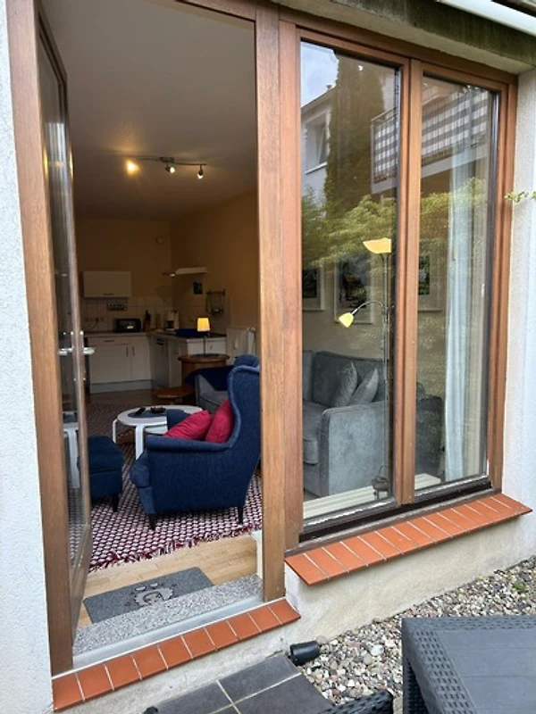 Die Fewo hat einen grünen Aussenbereich mit Terrasse nach Süden ausgerichtet und dazu entsprechende Gartenmöbel mit Auflage.