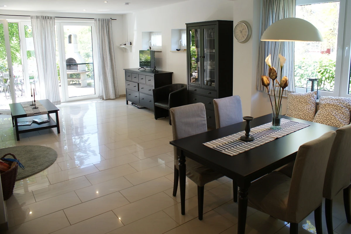 - Wohnzimmer mit Couch (mit Schlaffunktion für 2 Personen), TV, Radio, Essbereich für 4 Personen