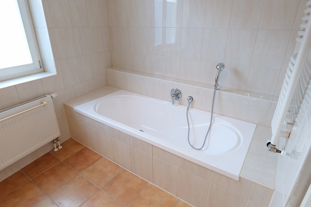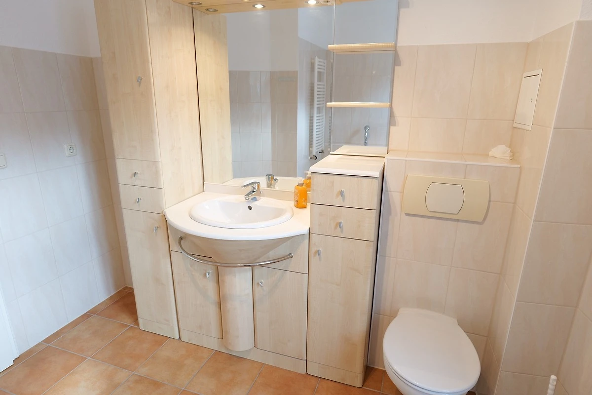 - 1. Badezimmer mit Badewanne, WC, Waschbecken, Spiegelschrank, Waschmaschine