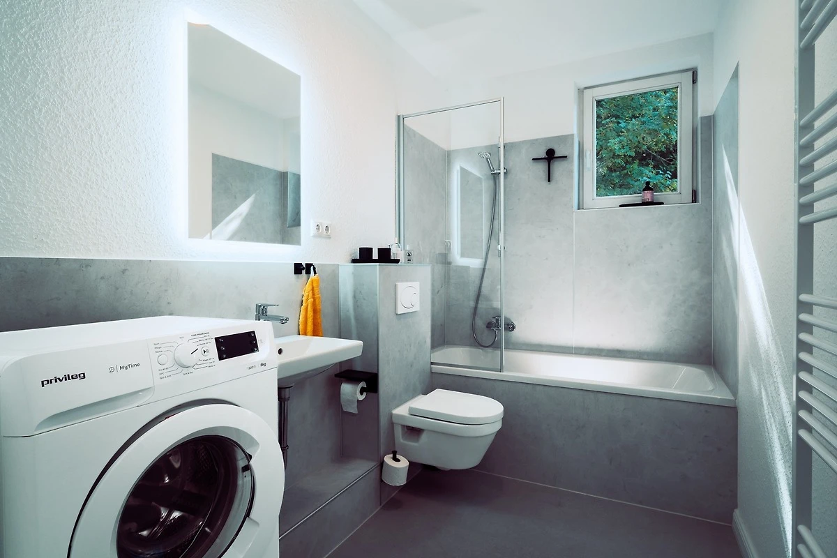 - Das Badezimmer ist mit einer Badewanne mit Duschfunktion und einem WC ausgestattet – auch eine Waschmaschine steht Ihnen hier zur Verfügung.