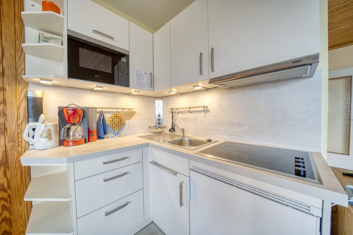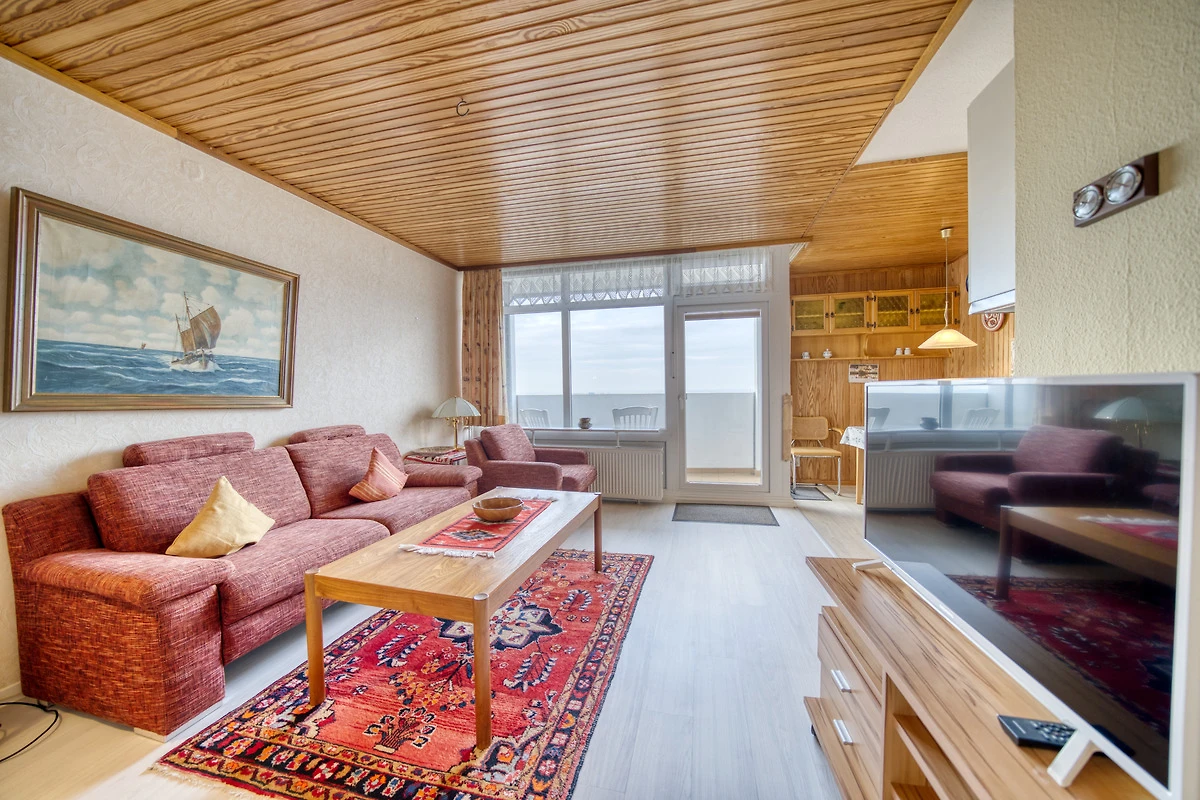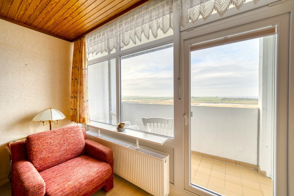 Wohn-/Schlafbereich mit zwei Einzelbetten, Essecke und Sofa mit Flachbild-TV. Balkon mit Panoramablick. Küche mit Ceranherd, Mikrowelle, Toaster, Filterkaffeemaschine und Kühlschrank mit Gefrierfach. Bad mit Duschkabine und Handtuchtrockner. Bonus: WLAN inklusive. Nichtraucher, keine Haustiere, Fahrstuhl, Fahrradräume, ca. 300 m zum Strand, Parkplatz hinter dem Ferienpark. Ferienpark mit Schwimmbad, Sauna, Wellness, Läden und Kinderspielwelt.