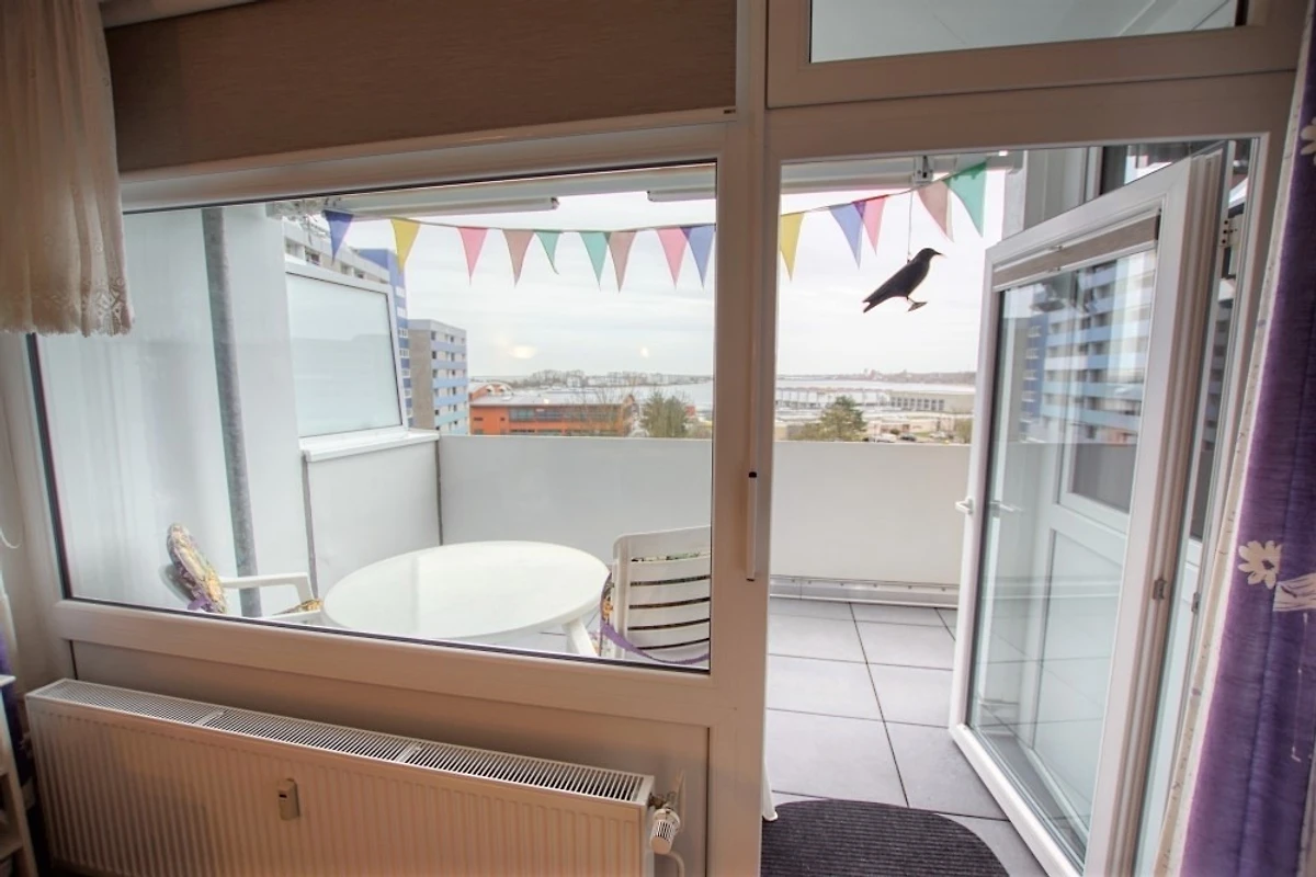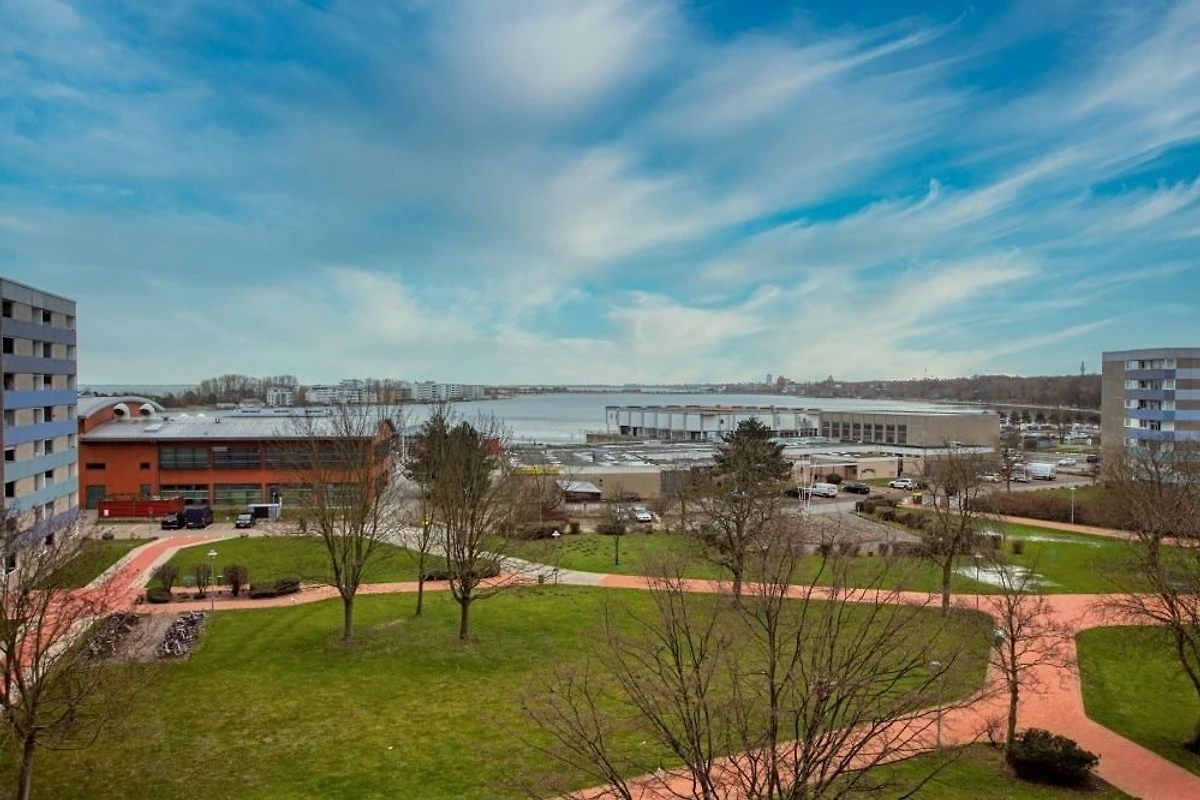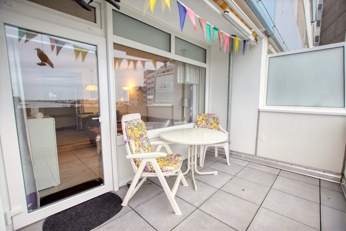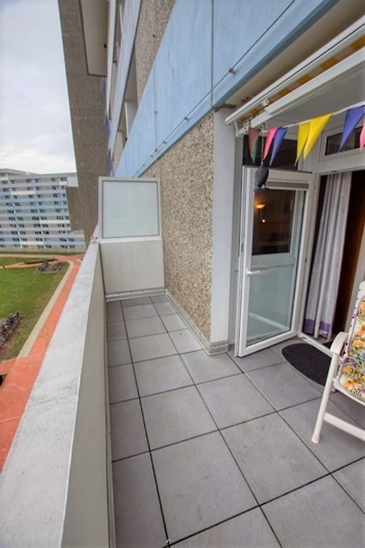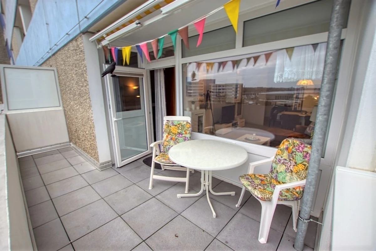 Die Ferienwohnung im Haus F, 5. Etage, mit Balkon zur Ostseite, bietet einen herrlichen Blick auf den grossen Binnensee und den Innenhof.