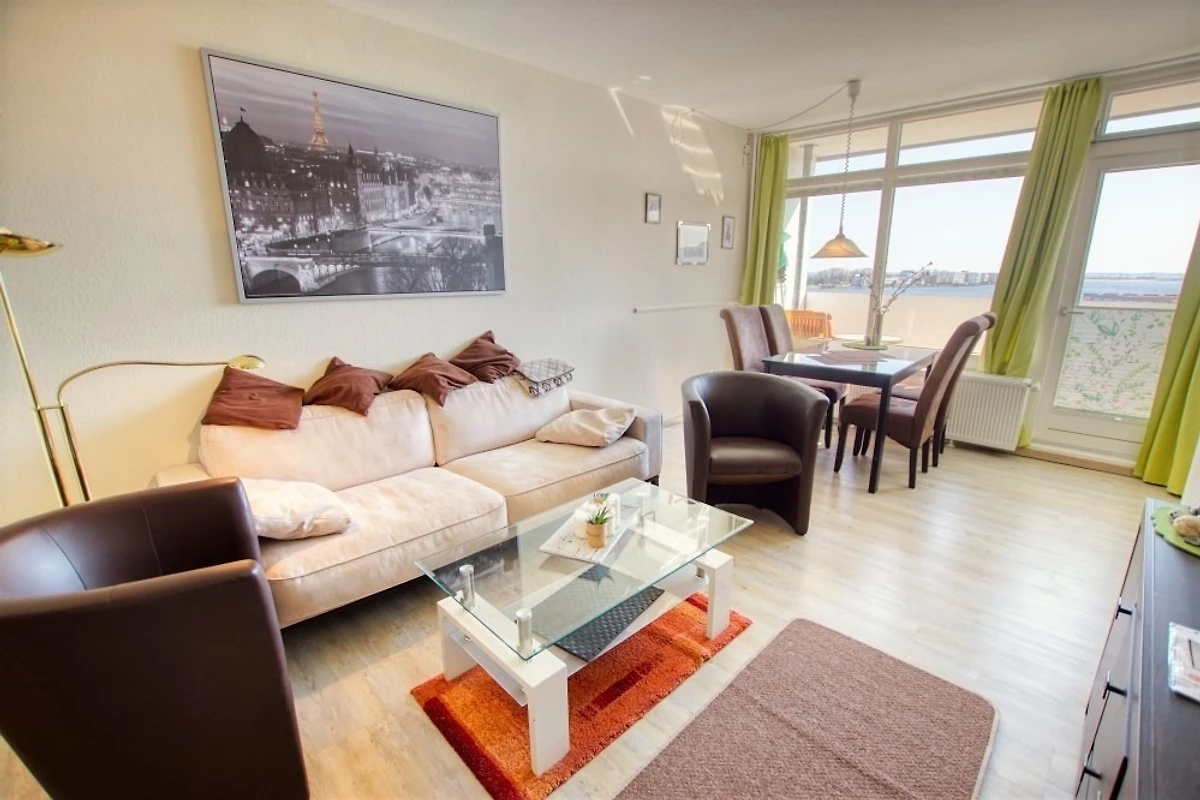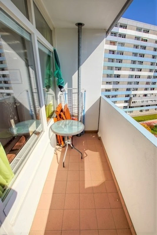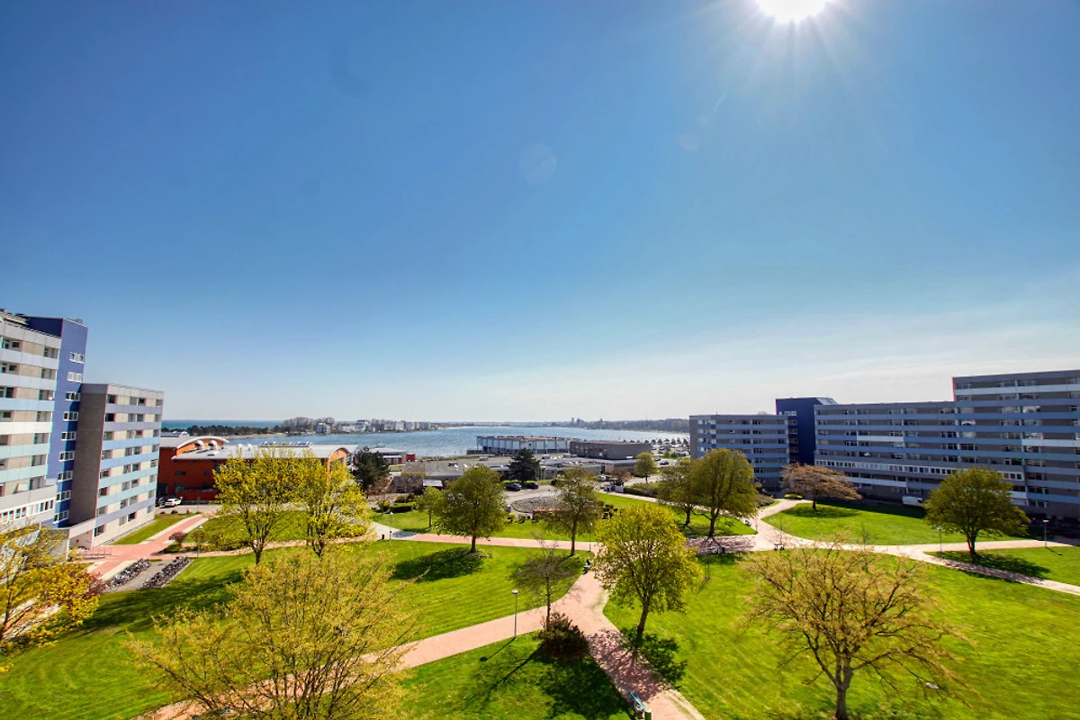 Die Ferienwohnung im Haus F, 6. Etage, mit Balkon zur Ostseite, bietet einen herrlichen Blick auf die Ostsee, den grossen Binnensee, die Fehmarnsundbrücke, die Stadt und den Yachthafen.