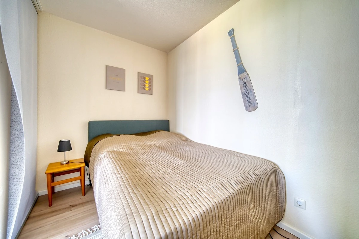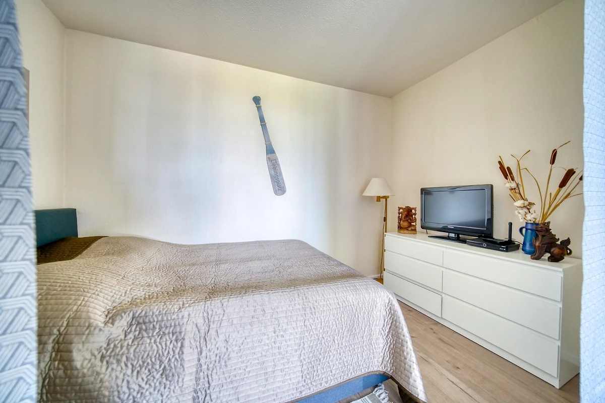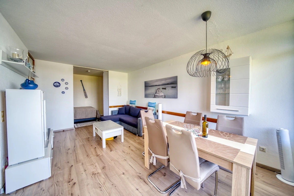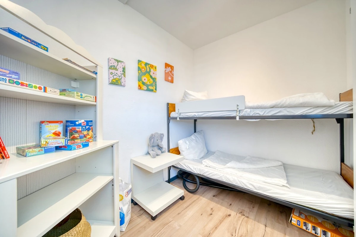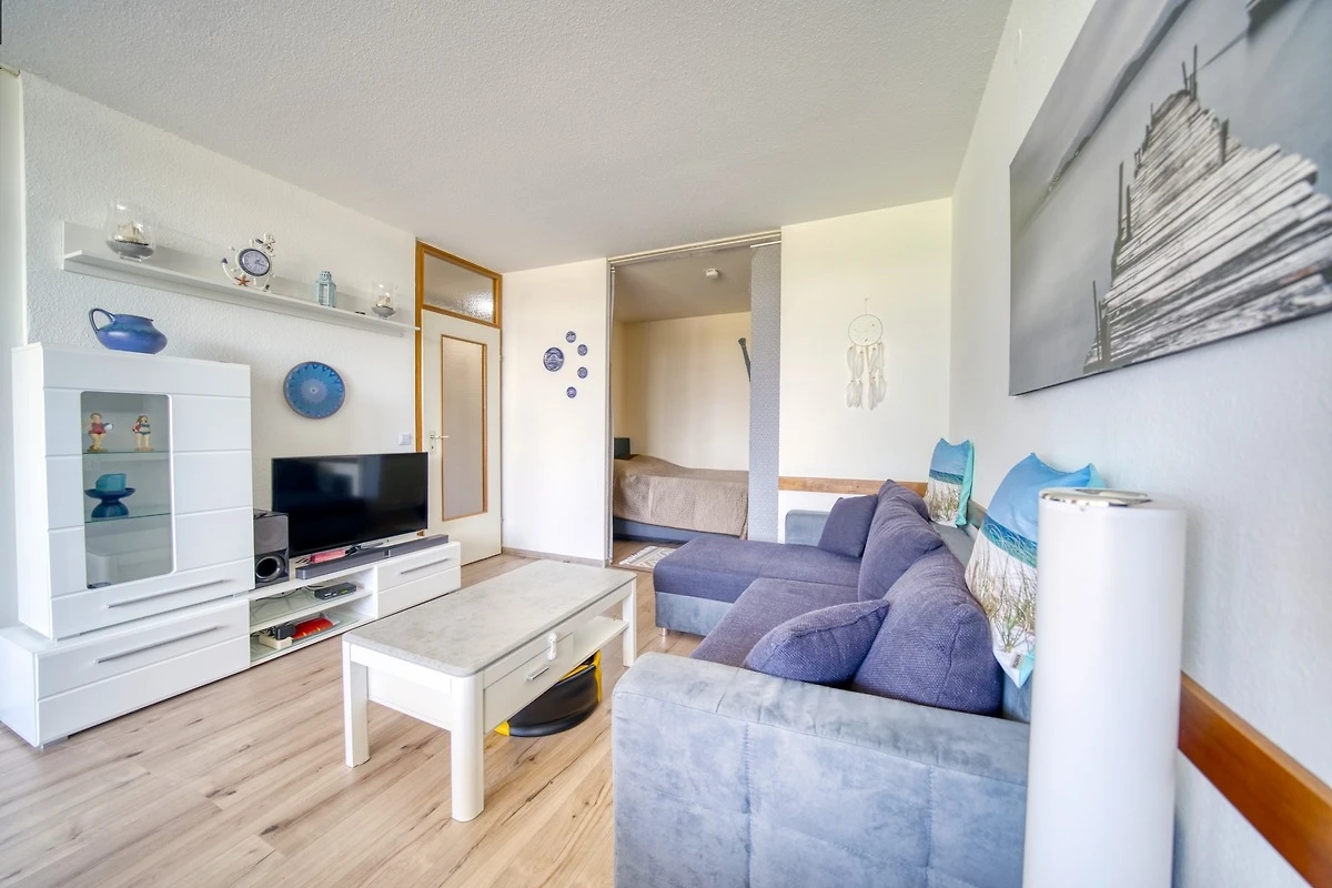 Die 45 m² Wohnung bietet Wohn-/Esszimmer mit Flachbild-TV und Radio, Elternschlafbereich mit zwei Einzelbetten, Kinderzimmer mit Etagenbett, Küche mit 4-Plattenherd, Kühlschrank und Geschirrspüler sowie Bad mit WC und Dusche. WLAN inklusive. Nichtraucher, keine Haustiere, Fahrradräume im Ferienpark, Parkplatz hinter dem Ferienpark. Ca. 300 m zum Strand, kurzer Fussweg über die Promenade. Ideal für bis zu 4 Personen. Ferienpark mit Aktiv-Hus, Schwimmbad, Sauna, Wellness und Kinderspielwelt.