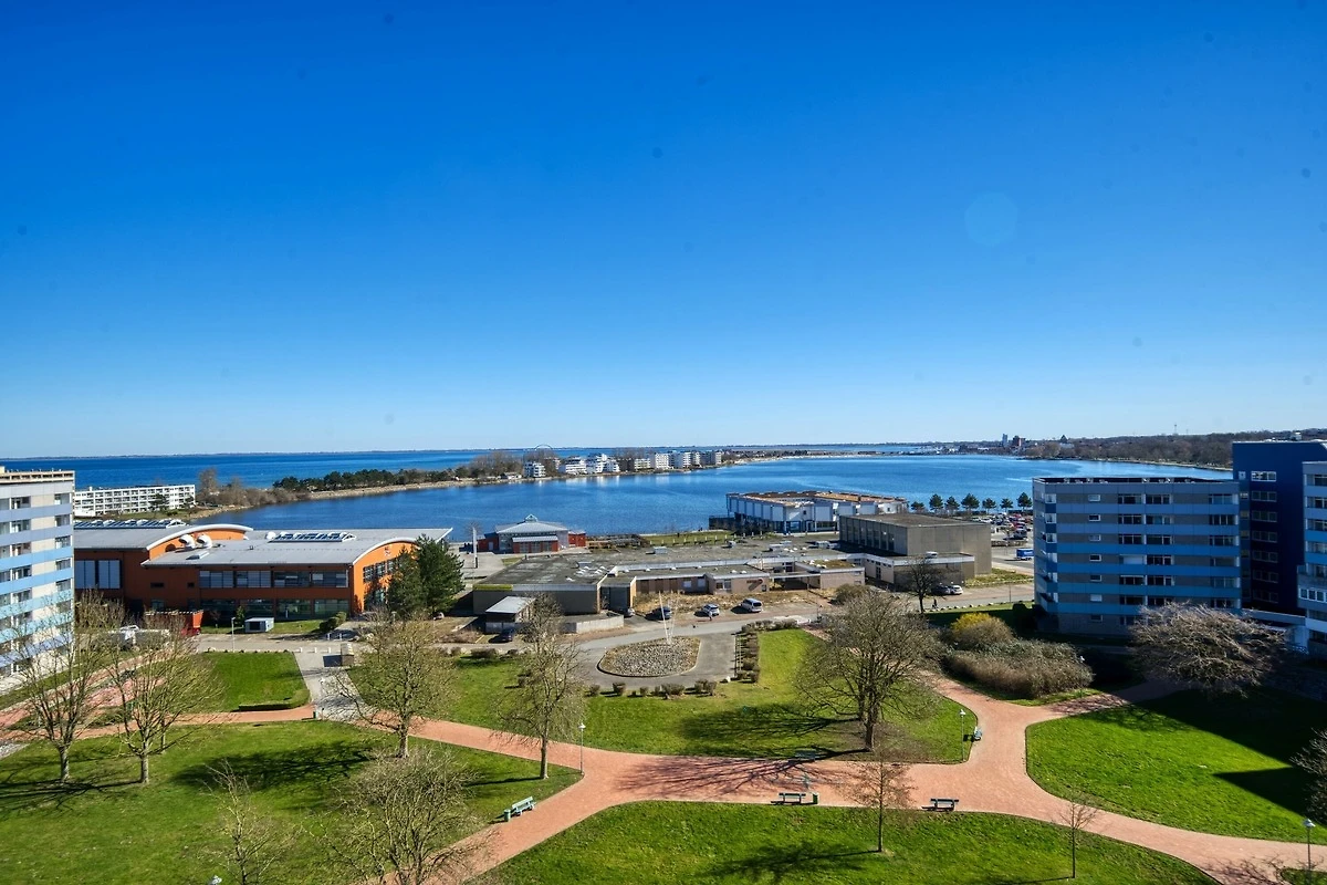 Vom Balkon im 9ten OG geniessen Sie einen schönen Blick auf den Binnensee, die Stadt und bis zur Ostsee – ideal für entspannte Stunden im Freien. Der Ferienpark bietet zudem vielfältige Freizeitmöglichkeiten für einen gelungenen Urlaub an der Ostsee.