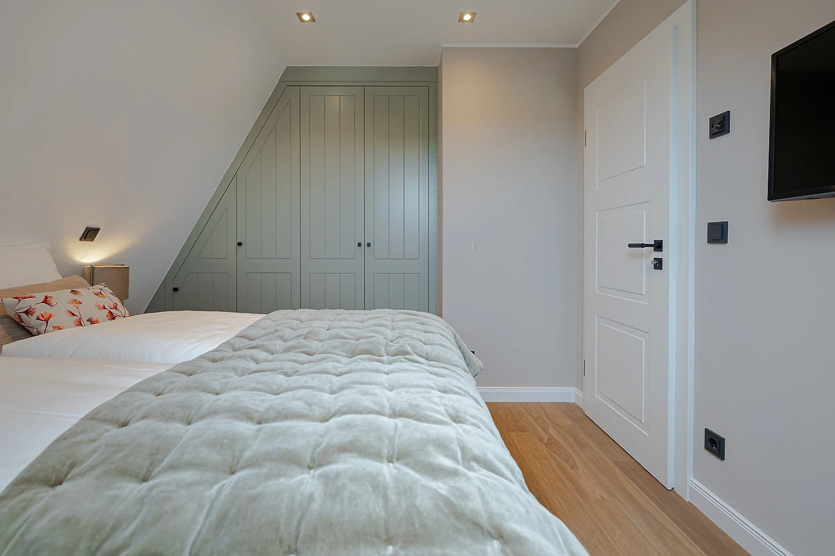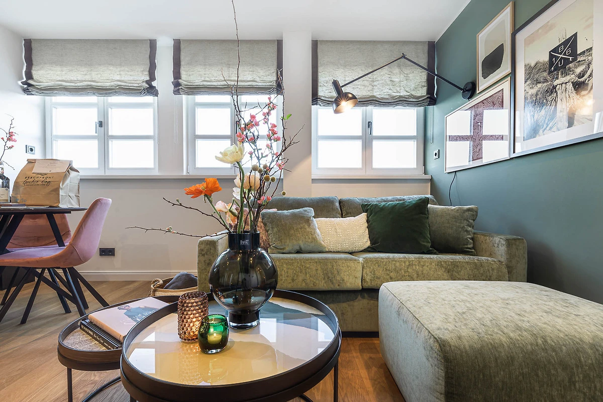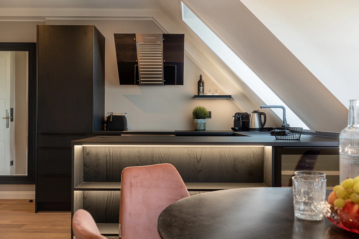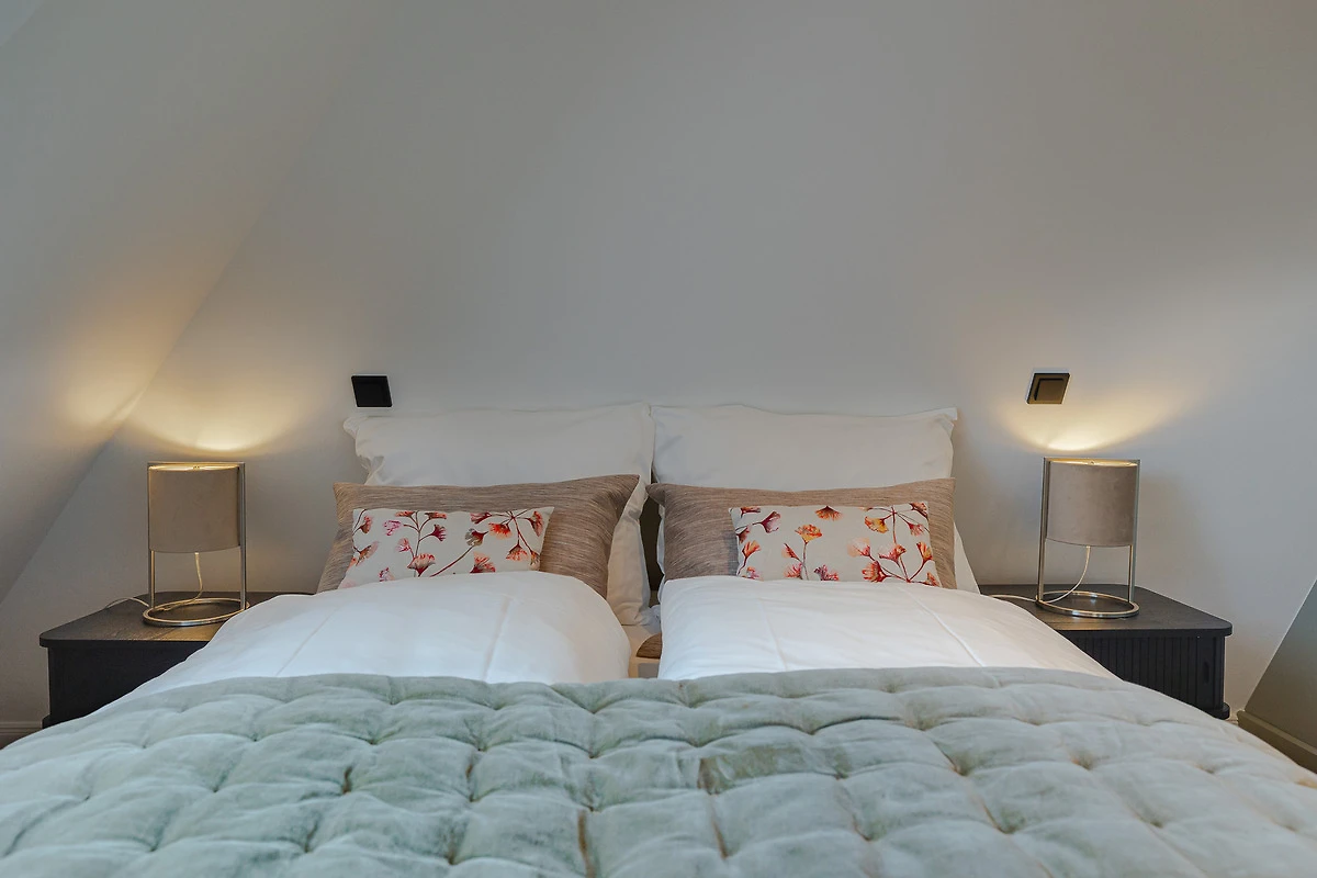 Das Apartment überzeugt mit hohen Decken, lichtdurchfluteten Räumen und moderner Einrichtung. Beim Betreten gelangen Sie in den offenen Wohn- und Essbereich inklusive Schlafsofa. Im Schlafzimmer erwartet Sie ein exklusives COCO-MAT Boxspringbett für besten Schlafkomfort. Die Küche ist mit Gaggenau- und Miele-Geräten ausgestattet – so macht Kochen im Urlaub gleich doppelt Freude. Bei Ankunft erhalten Sie ein Starterpaket für Bad und Küche.