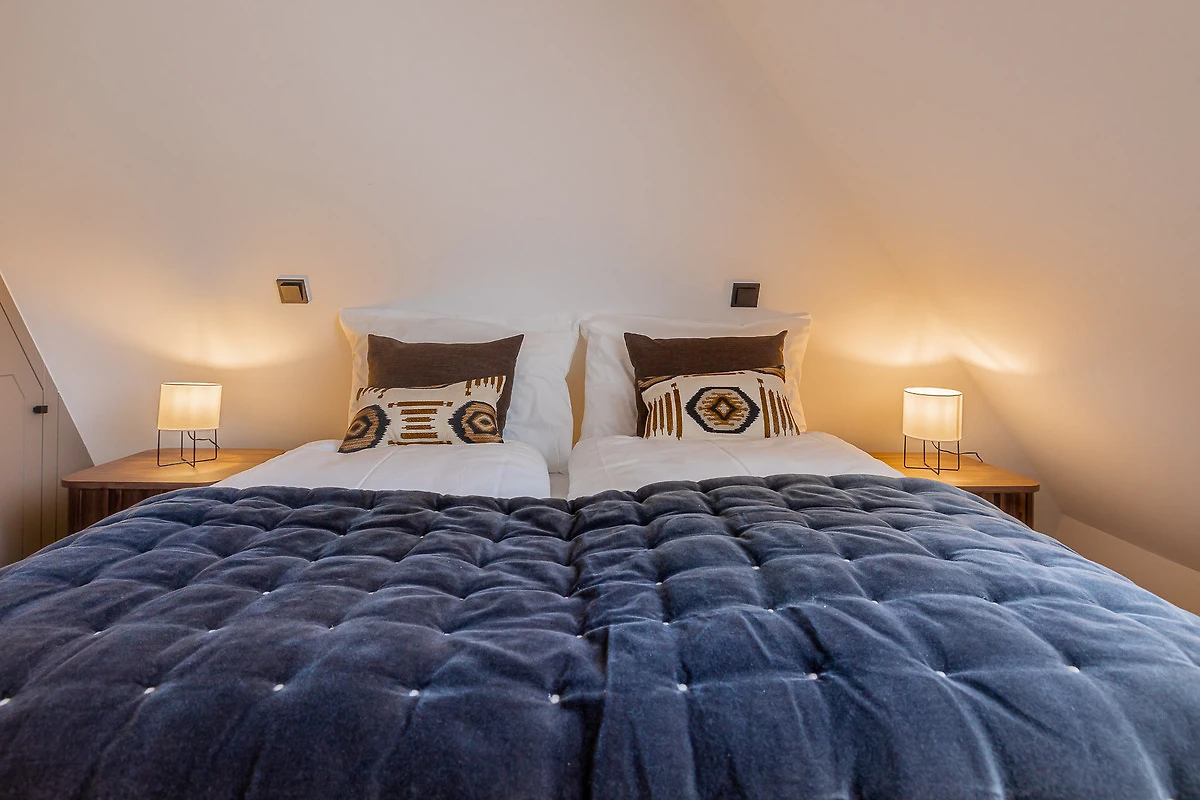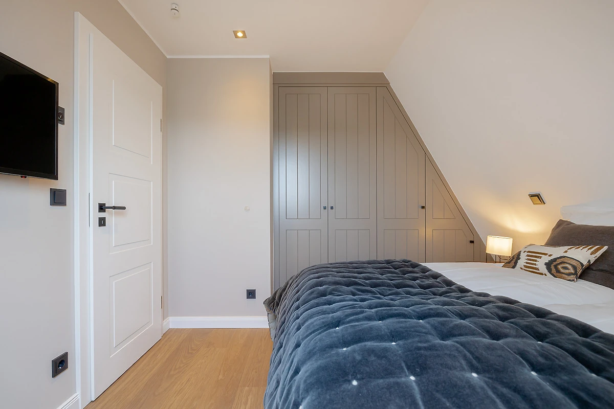 Das Schlafzimmer mit grossem Boxspringbett schenkt Ihnen ruhige Nächte nach langen Strandspaziergängen. Auf der oberen Etage erwartet Sie ein zusätzlicher Wohn und Arbeitsbereich mit Schreibtisch, weiterem Schlafsofa sowie ein zweites WC Badezimmer. Ideal für Familien oder Gäste, die sich zwischendurch etwas zurückziehen möchten.