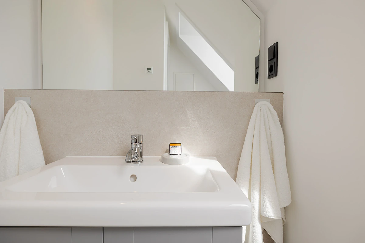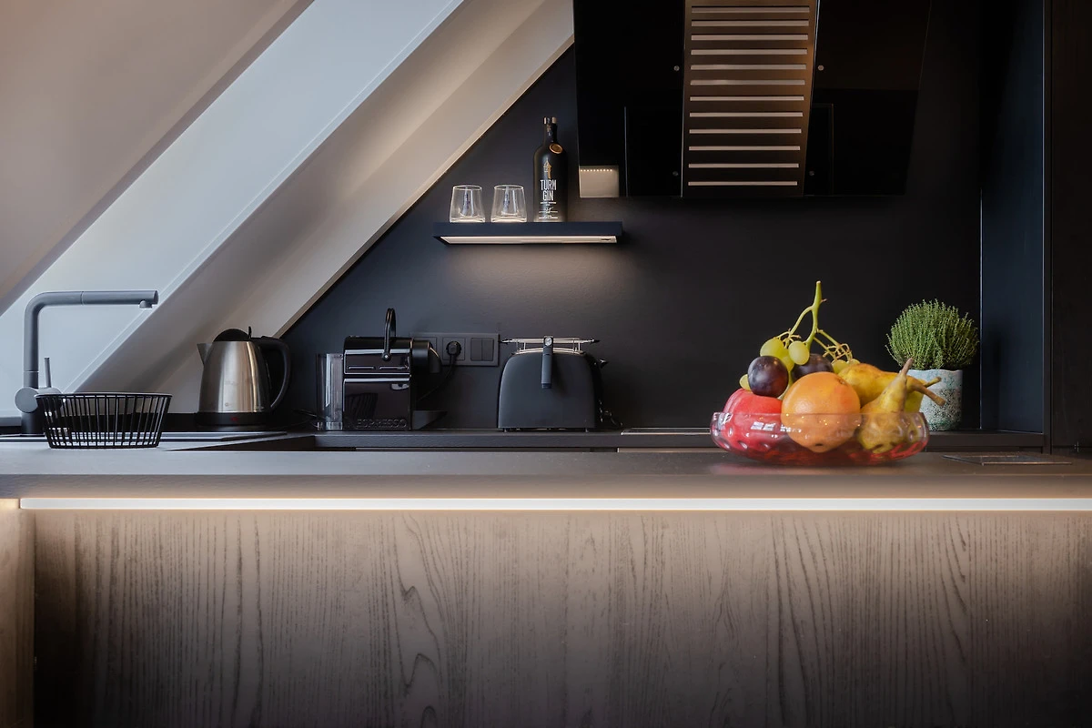 Im unteren Wohnbereich befinden sich das gemütliche Wohnzimmer mit vollwertigem Schlafsofa, der Essbereich und die hochwertige Küche. Ausgestattet mit Geräten von Miele lädt sie dazu ein, den Tag mit einem entspannten Frühstück zu beginnen oder abends gemeinsam zu kochen. Das moderne Bad in sanften Farben von Meer und Sand mit grosszügiger Regendusche wird schnell zu Ihrer kleinen Wellnessoase.