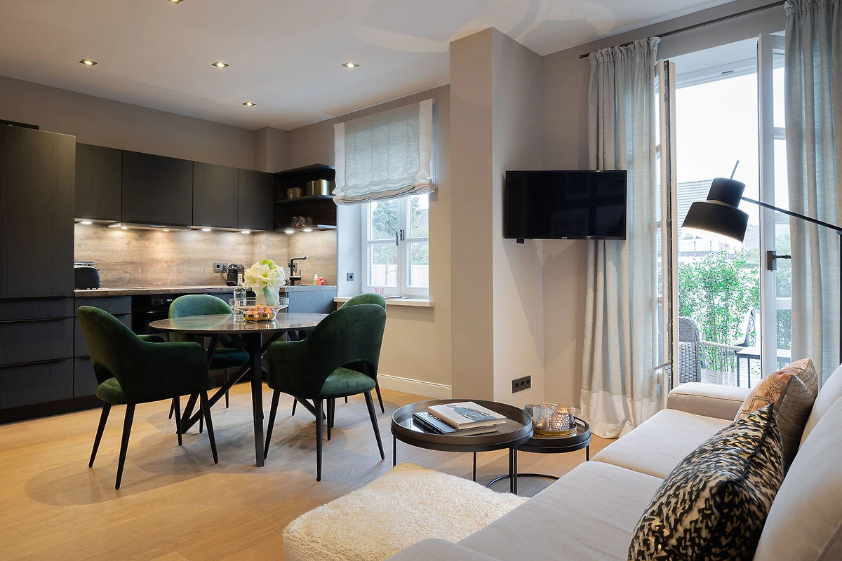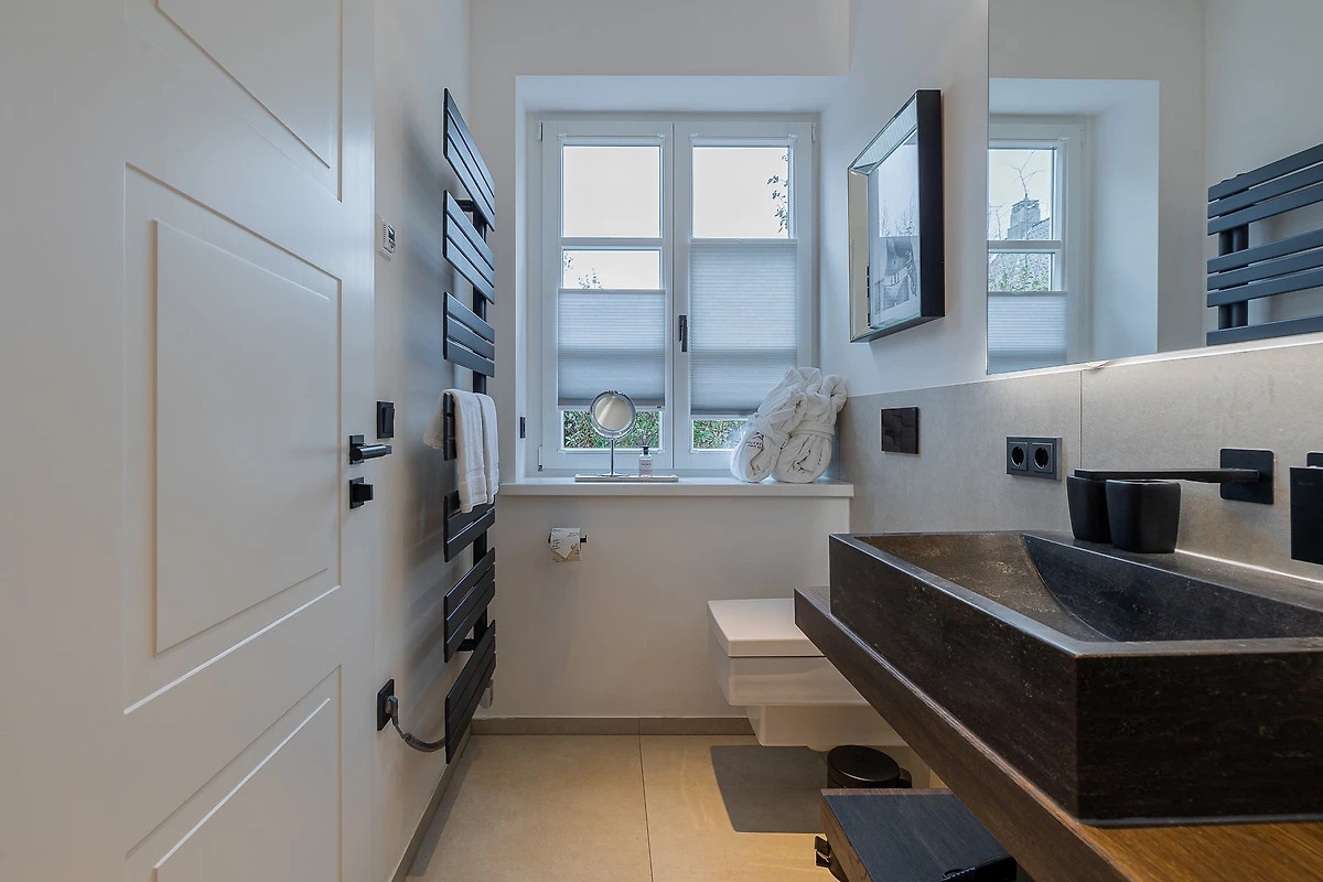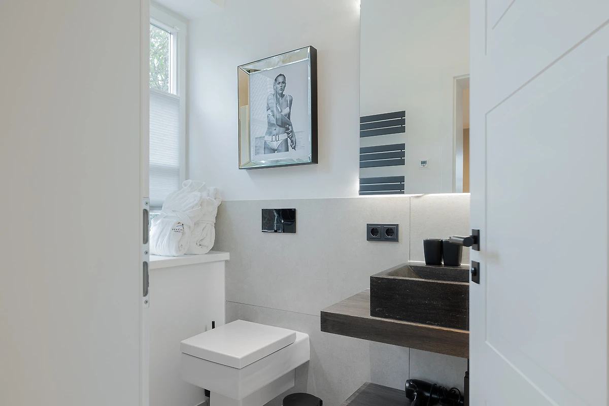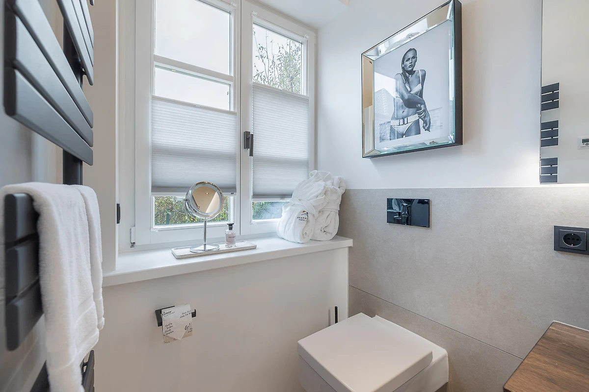 Die hochwertige Küche ist mit exklusiven Geräten von Gaggenau und Miele ausgestattet und ideal für alles vom entspannten Frühstück bis zum gemeinsamen Abendessen. Ein besonderes Highlight ist die eigene Terrasse in Westlage – perfekt, um den Tag bei einem Glas Wein und einem Sonnenuntergang ausklingen zu lassen.