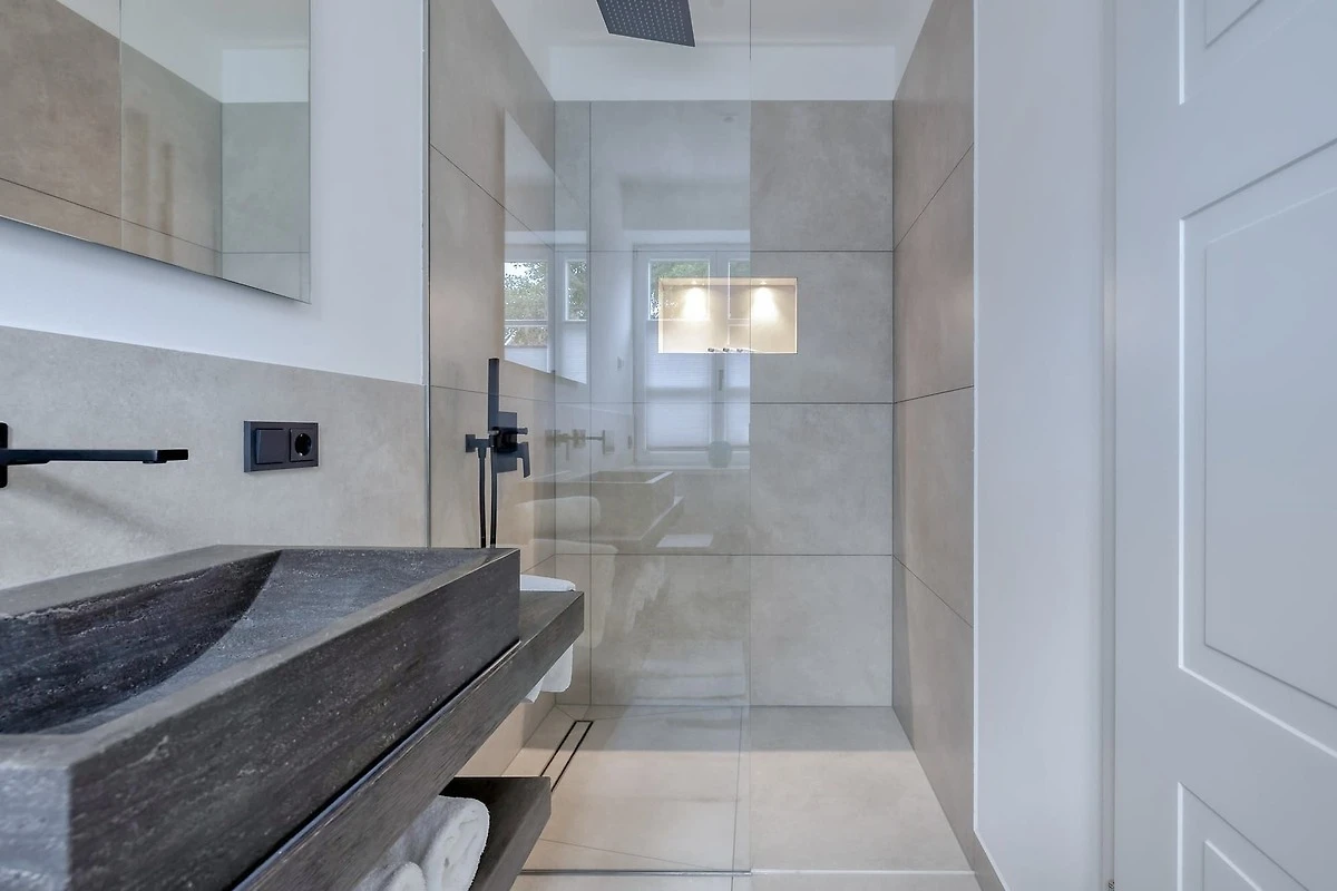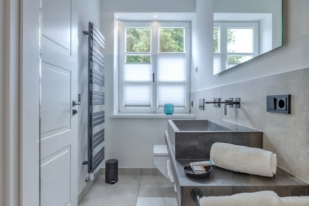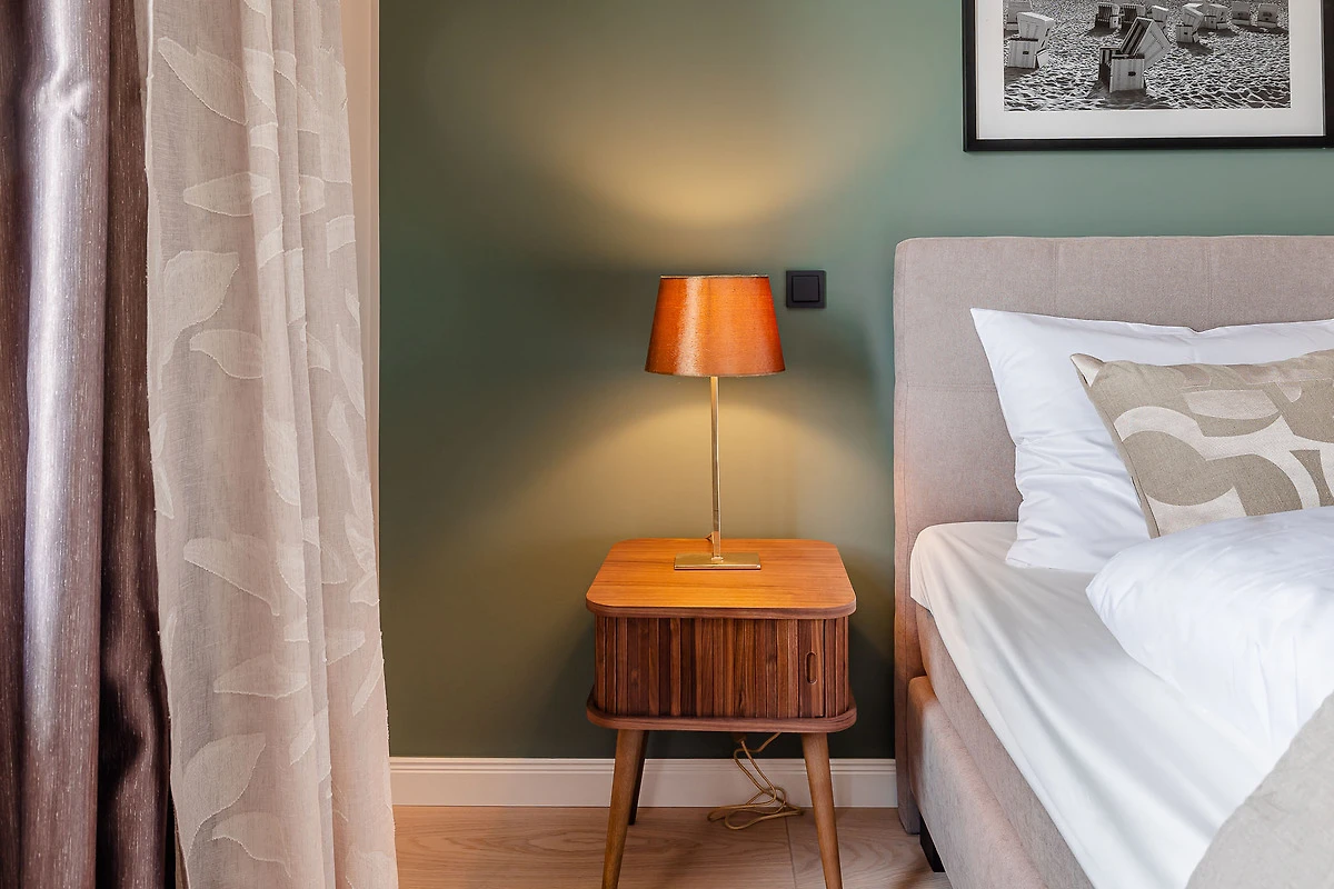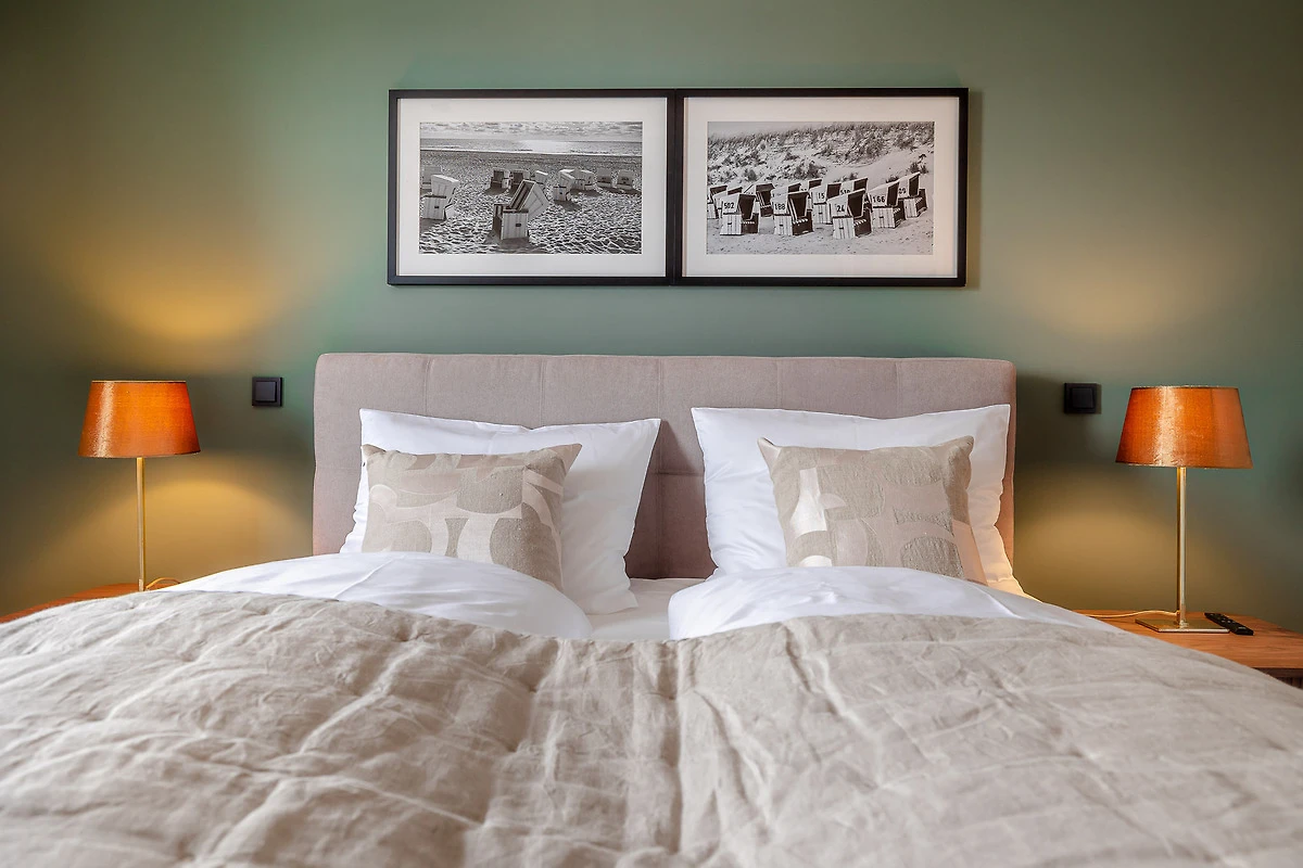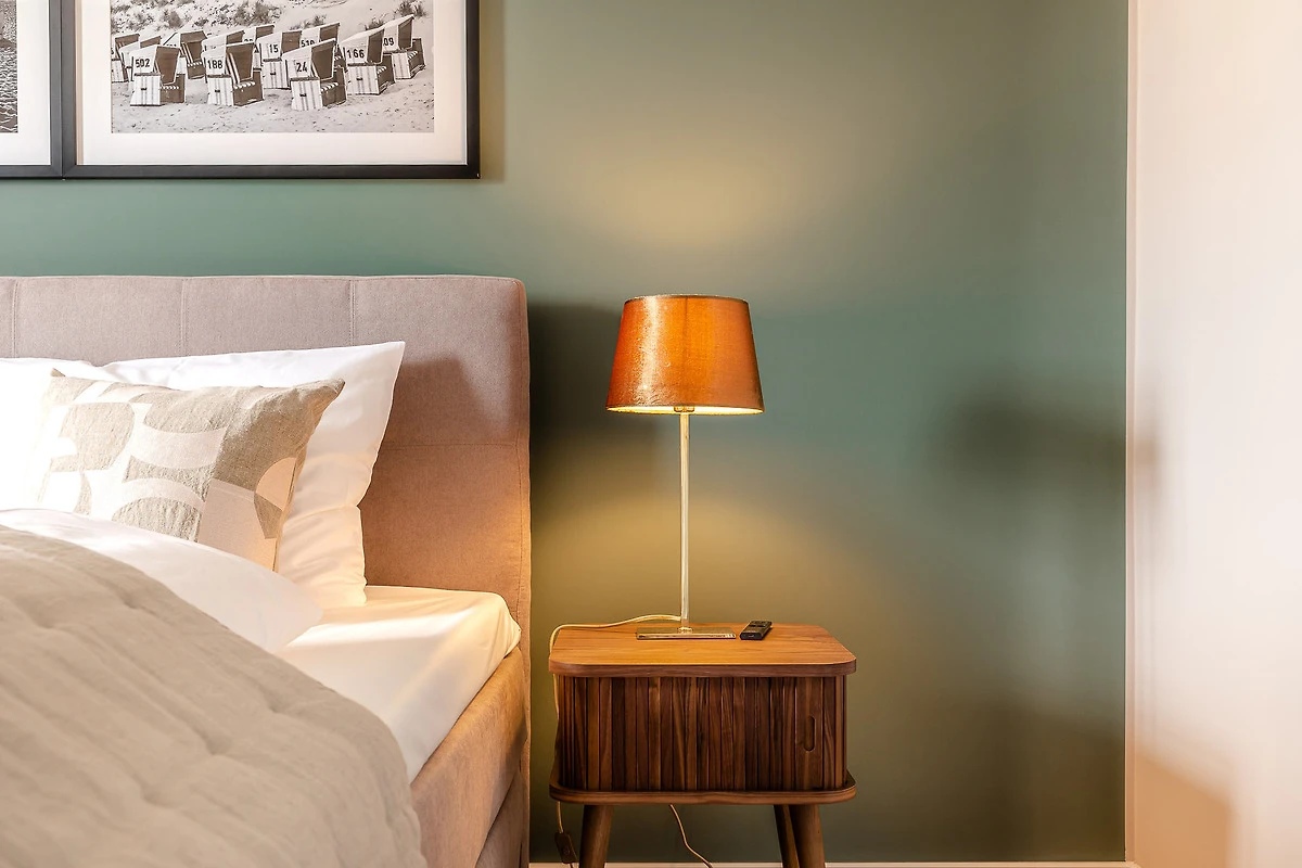 Das Schlafzimmer ist mit einem grossen, komfortablen Boxspringbett ausgestattet und lädt zu erholsamen Nächten nach langen Strandspaziergängen ein. Das moderne Badezimmer verwöhnt Sie mit einer grosszügigen Regendusche, ideal für entspannte Momente nach einem aktiven Tag. Fussbodenheizung im gesamten Apartment sorgt das ganze Jahr über für wohlige Wärme.