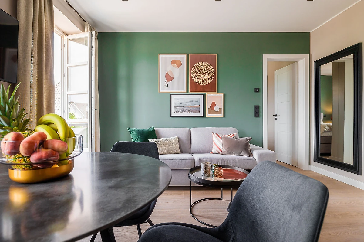 Helle, lichtdurchflutete Räume, klares Design und ausgewählte Materialien schaffen eine angenehme Balance aus Ruhe und urbaner Leichtigkeit. Der Wohn- und Essbereich öffnet sich direkt zum westlich ausgerichteten Balkon. Ein wunderbarer Ort, um an warmen Abenden den Sonnenuntergang bei einem Glas Wein zu geniessen. Im Wohnbereich befindet sich zudem ein bequemes Schlafsofa für zusätzliche Flexibilität.
