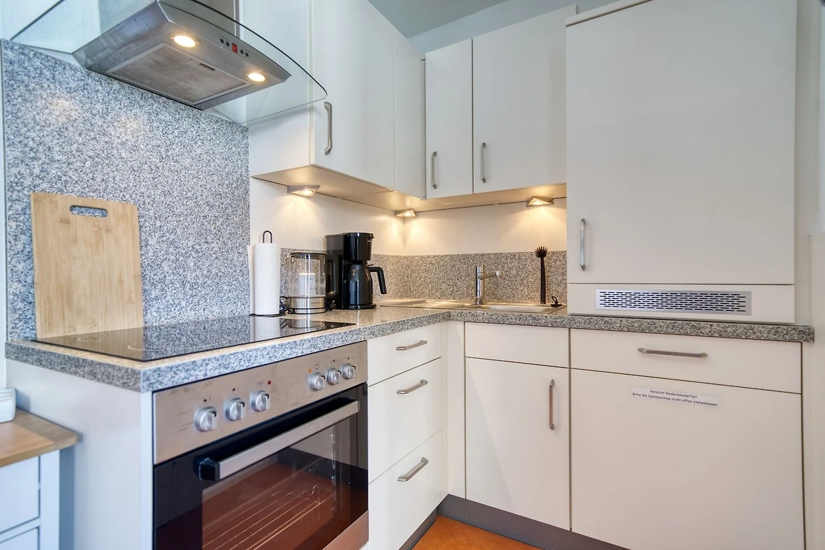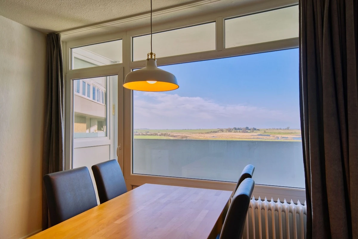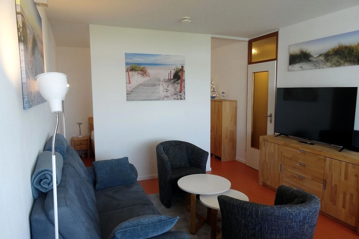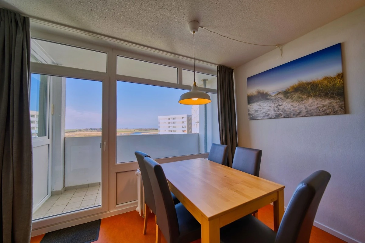 Moderne, renovierte Ferienwohnung in der 6. Etage des Hauses M mit Balkon in Südwestlage und herrlichem Blick über die Salzwiesen bis zur Ostsee. Wohn-Esszimmer mit Flachbild-TV, Elternschlafbereich mit hochwertigen Matratzen, separates Kinderzimmer mit Etagenbett. Voll ausgestattete Küche mit Ceranfeld, Backofen, Geschirrspüler und Kühlschrank mit Eisfach. Bad mit WC und Dusche. Bonus: WLAN (Glasfaser). Nichtraucherwohnung, keine Haustiere. Max. 4 Personen. Fahrstuhl vorhanden, kostenloser Parkplatz. Strand ca. 300 m. Nähe Aktiv-Hus mit Schwimmbad, Sauna, Wellness und Kinderspielwelt für abwechslungsreiche Freizeitgestaltung.
