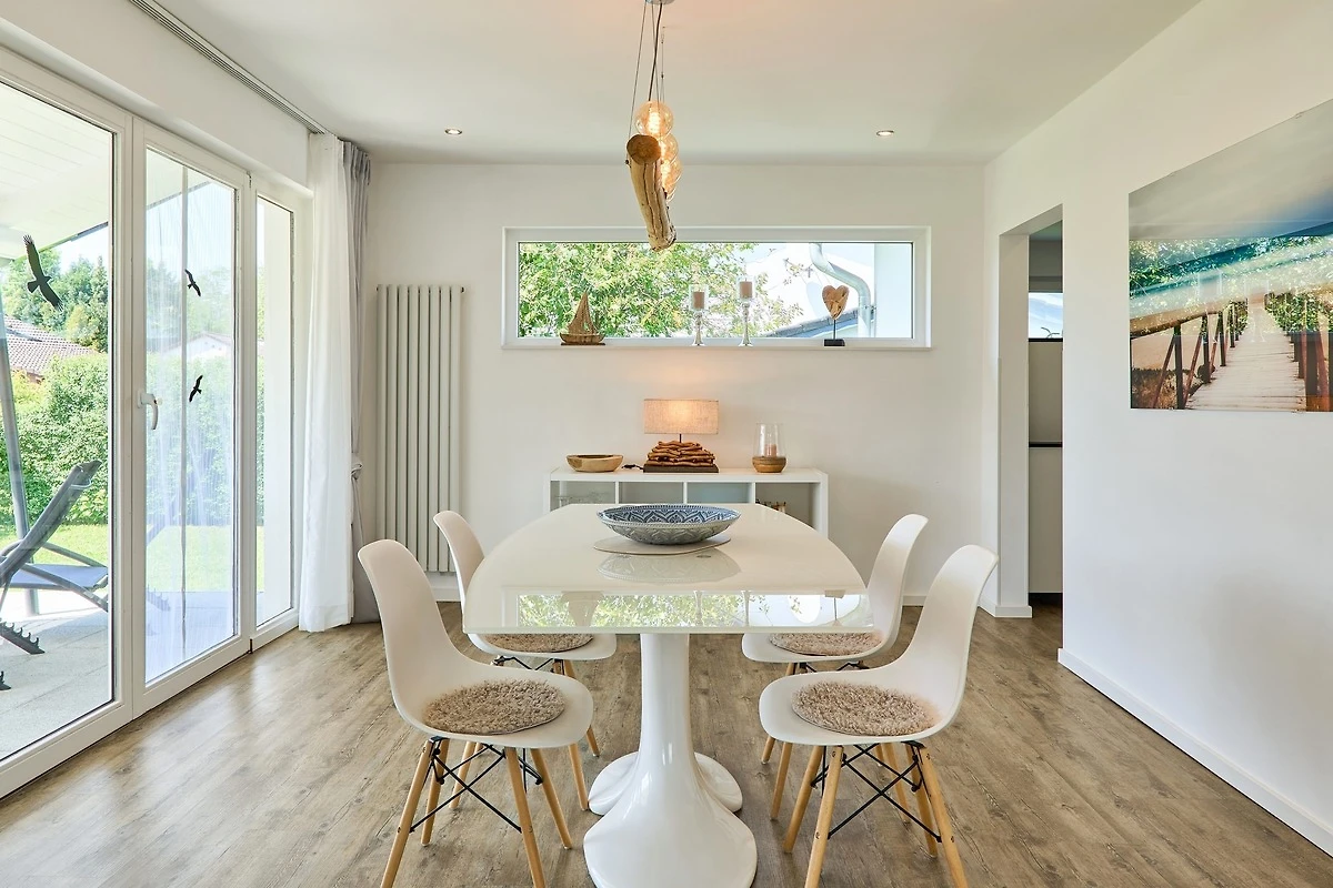 Am Ende von dem Flurbereich gelangen Sie in das herrlich, lichtdurchflutete Wohnzimmer. Hier stehen Ihnen eine Sofaecke, ein TV, eine Relax Liege, ein Lesesessel sowie ein grosser Esstisch mit 4 Stühlen zur Verfügung. Über den Flurbereich erreichen Sie die Terrasse mit Überdachung sowie den grossen, eingezäunten Garten.