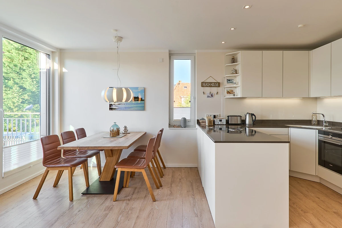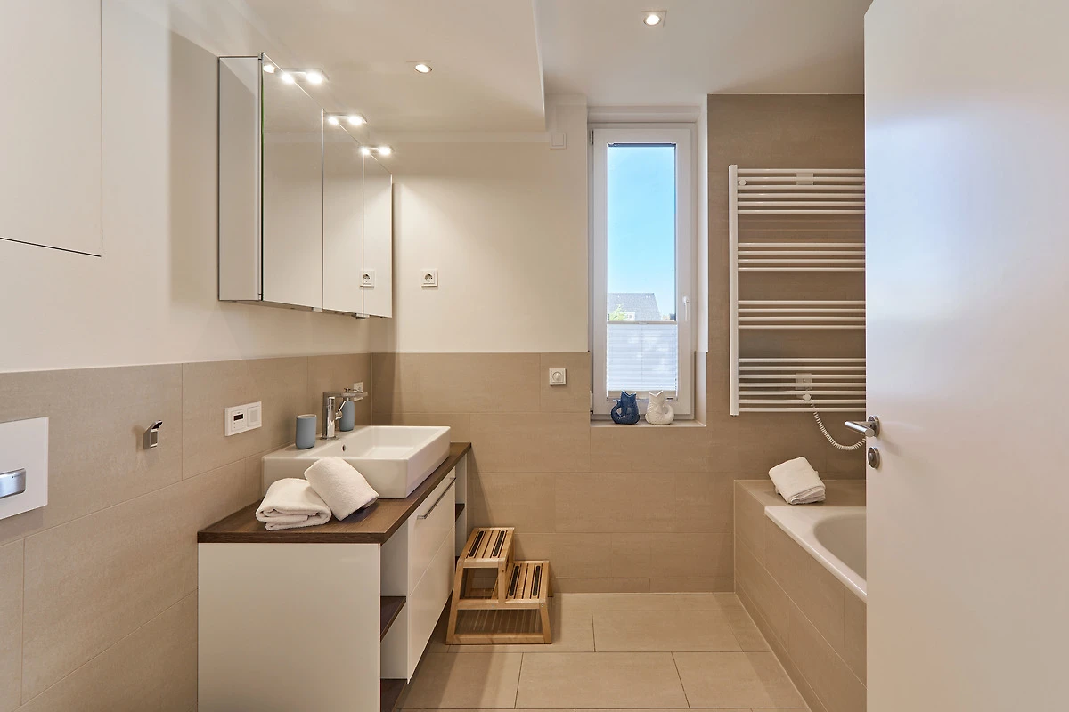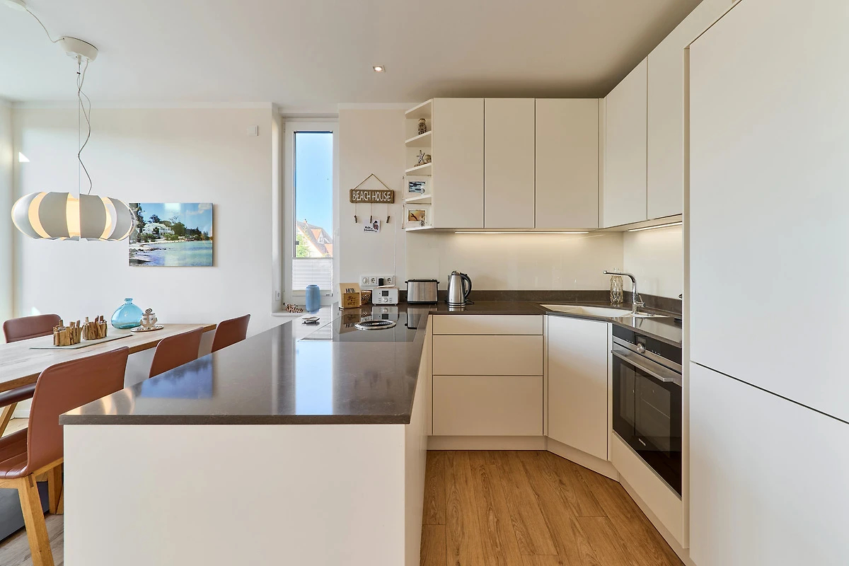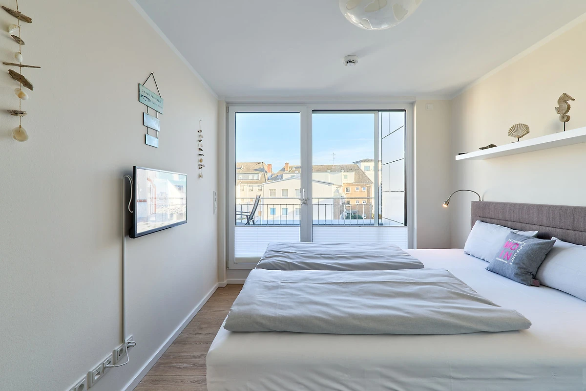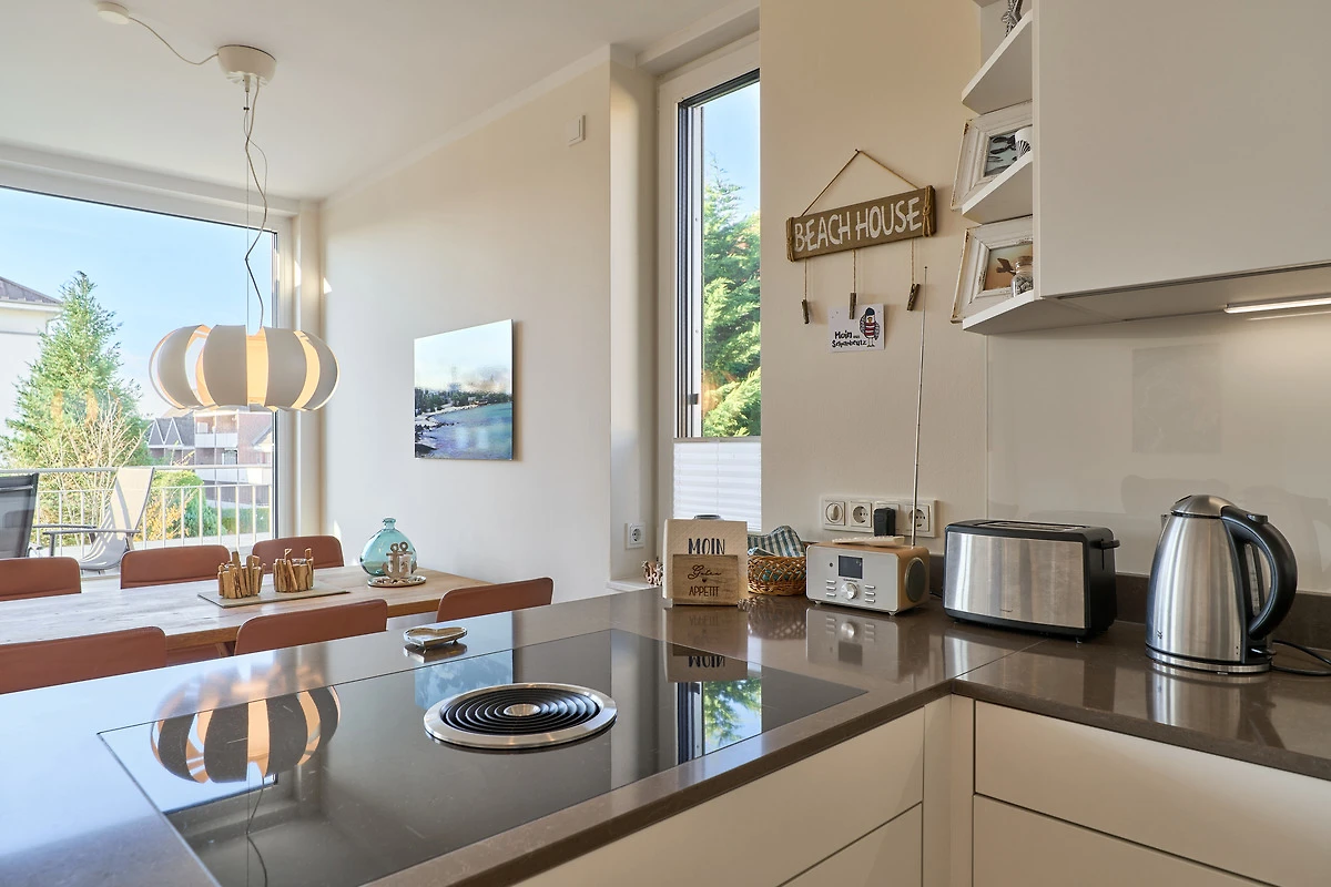 Durch die bodentiefen Fenster in den Schlafzimmern sowie im Wohn-und Essbereich strahlt diese schöne Ferienwohnung eine helle und freundliche Gemütlichkeit aus. Die moderne Einbauküche mit Tresen zum Wohnbereich ist komplett ausgestattet. Der Essbereich bietet genügend Platz für gemeinsame Abendessen und gemütliche Runden. Von hier aus gelangen Sie auf den herrlichen West-Balkon. Entspannen Sie in der Nachmittagssonne und lassen es sich gut gehen. Im lichtduchfluteten Wohnbereich erwarten Sie eine grosszügige Leder-Eck-Couch und ein Flachbildschirm. Beide Schlafzimmer haben direkten Zugang zum Ost-Balkon - aufwachen und wohlfühlen. Geniessen Sie den Morgen bei Ihrem ersten Café und atmen Sie die frische Ostseeluft ein. Die Schlafzimmer sind jeweils mit einem Doppelbett (1,80 x 2,00m), einem Flachbild-TV und Kleiderschränken ausgestattet. Küstenschatz verfügt über zwei Duschbäder. Das erste Badezimmer im Emfpangsbereich verfügt über eine bodentiefe Dusche sowie einen Handtuchheizkörper. Das zweite, helle Badezimmer ist ein Tageslicht-Badezimmer und ist mit einer Badewanne und einem Handtuchheizkörper ausgestattet.