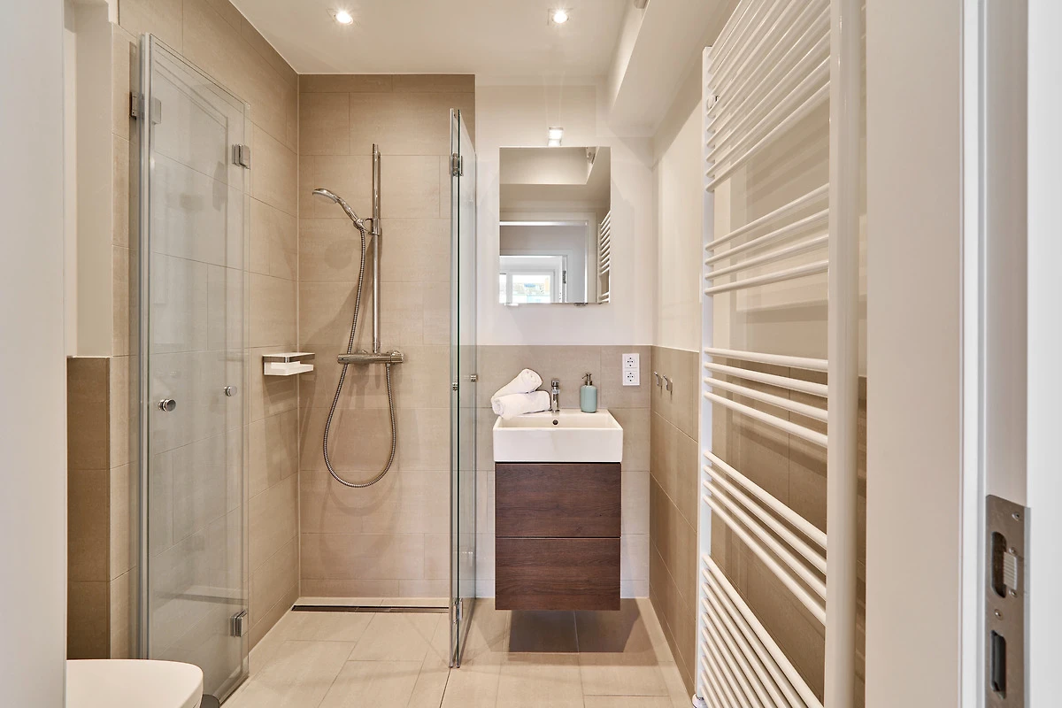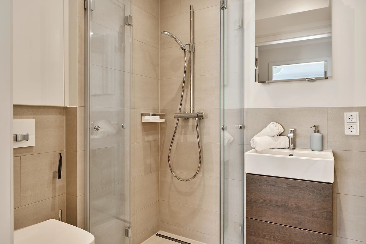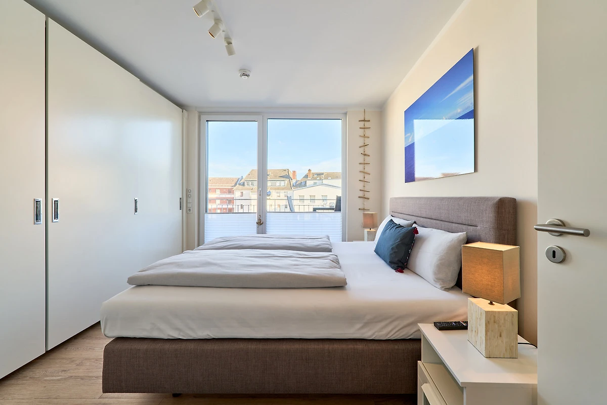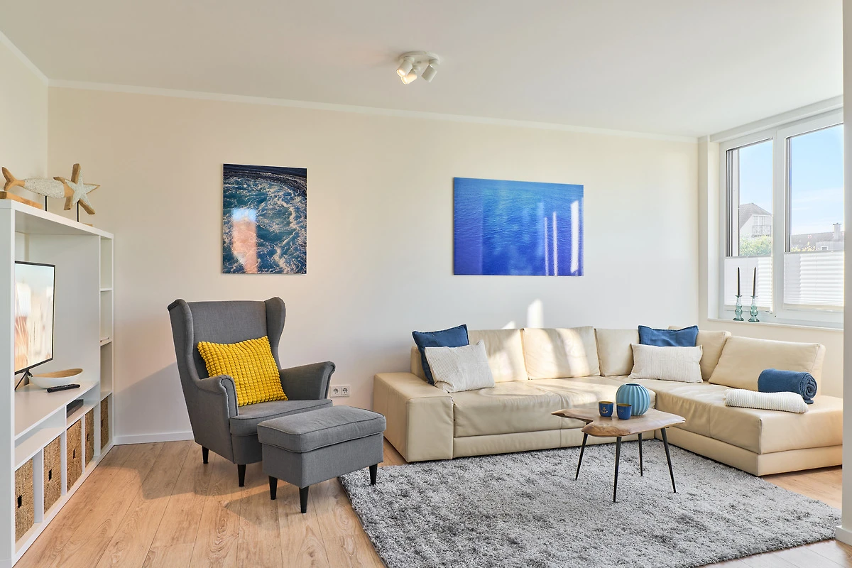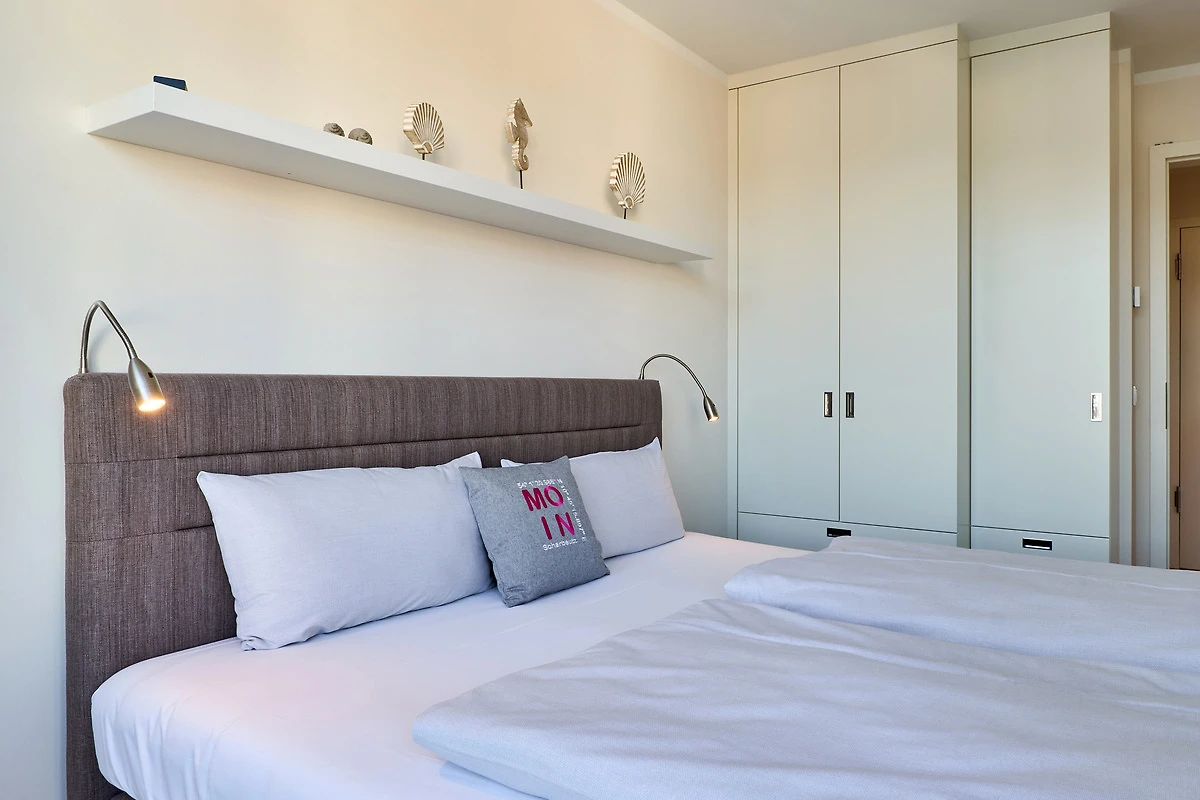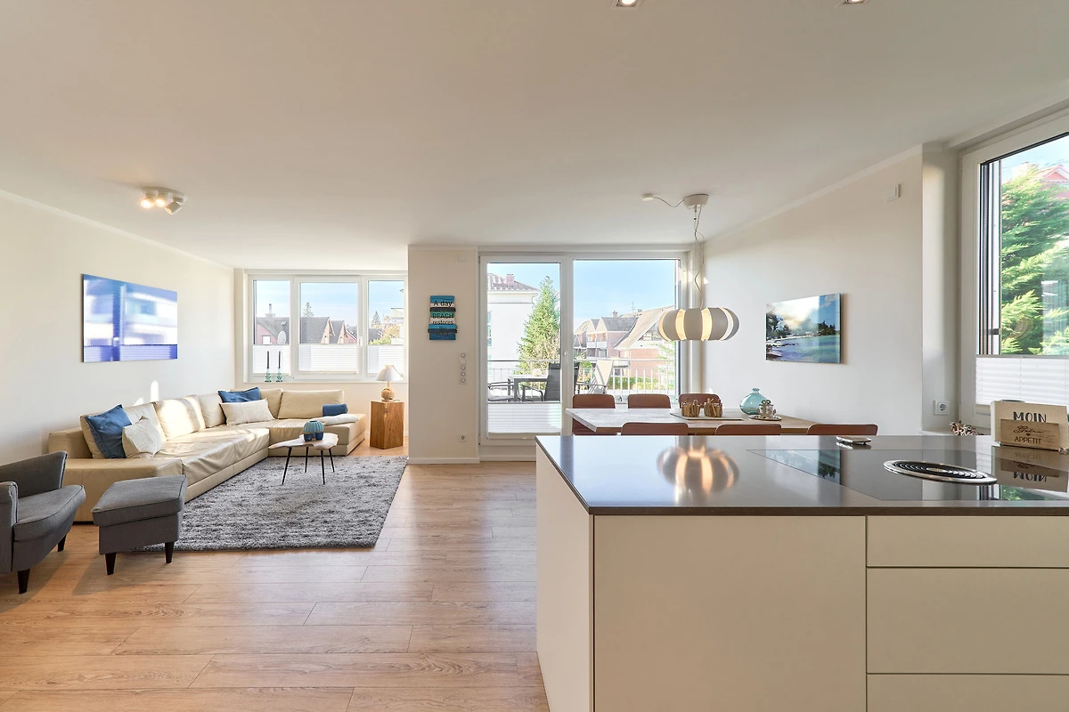 Durch die bodentiefen Fenster in den Schlafzimmern sowie im Wohn-und Essbereich strahlt diese schöne Ferienwohnung eine helle und freundliche Gemütlichkeit aus. Die moderne Einbauküche mit Tresen zum Wohnbereich ist komplett ausgestattet. Der Essbereich bietet genügend Platz für gemeinsame Abendessen und gemütliche Runden. Von hier aus gelangen Sie auf den herrlichen West-Balkon. Entspannen Sie in der Nachmittagssonne und lassen es sich gut gehen. Im lichtduchfluteten Wohnbereich erwarten Sie eine grosszügige Leder-Eck-Couch und ein Flachbildschirm. Beide Schlafzimmer haben direkten Zugang zum Ost-Balkon - aufwachen und wohlfühlen. Geniessen Sie den Morgen bei Ihrem ersten Café und atmen Sie die frische Ostseeluft ein. Die Schlafzimmer sind jeweils mit einem Doppelbett (1,80 x 2,00m), einem Flachbild-TV und Kleiderschränken ausgestattet. Küstenschatz verfügt über zwei Duschbäder. Das erste Badezimmer im Emfpangsbereich verfügt über eine bodentiefe Dusche sowie einen Handtuchheizkörper. Das zweite, helle Badezimmer ist ein Tageslicht-Badezimmer und ist mit einer Badewanne und einem Handtuchheizkörper ausgestattet.