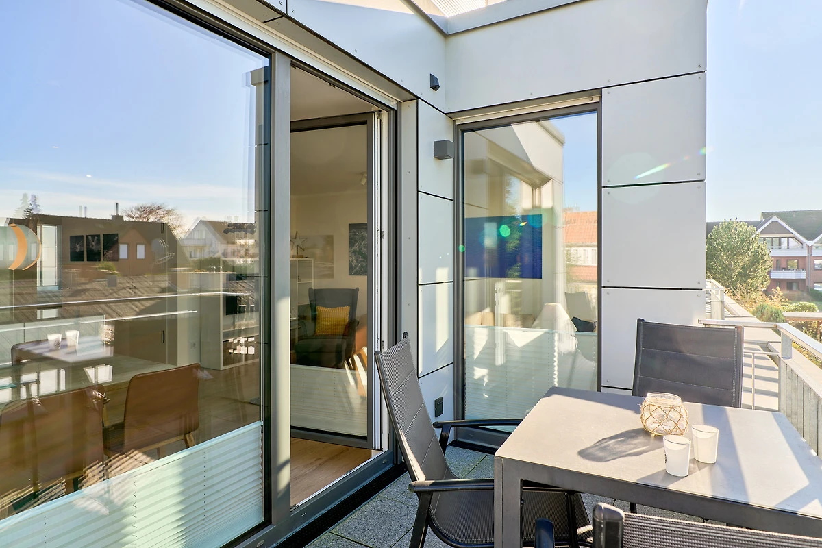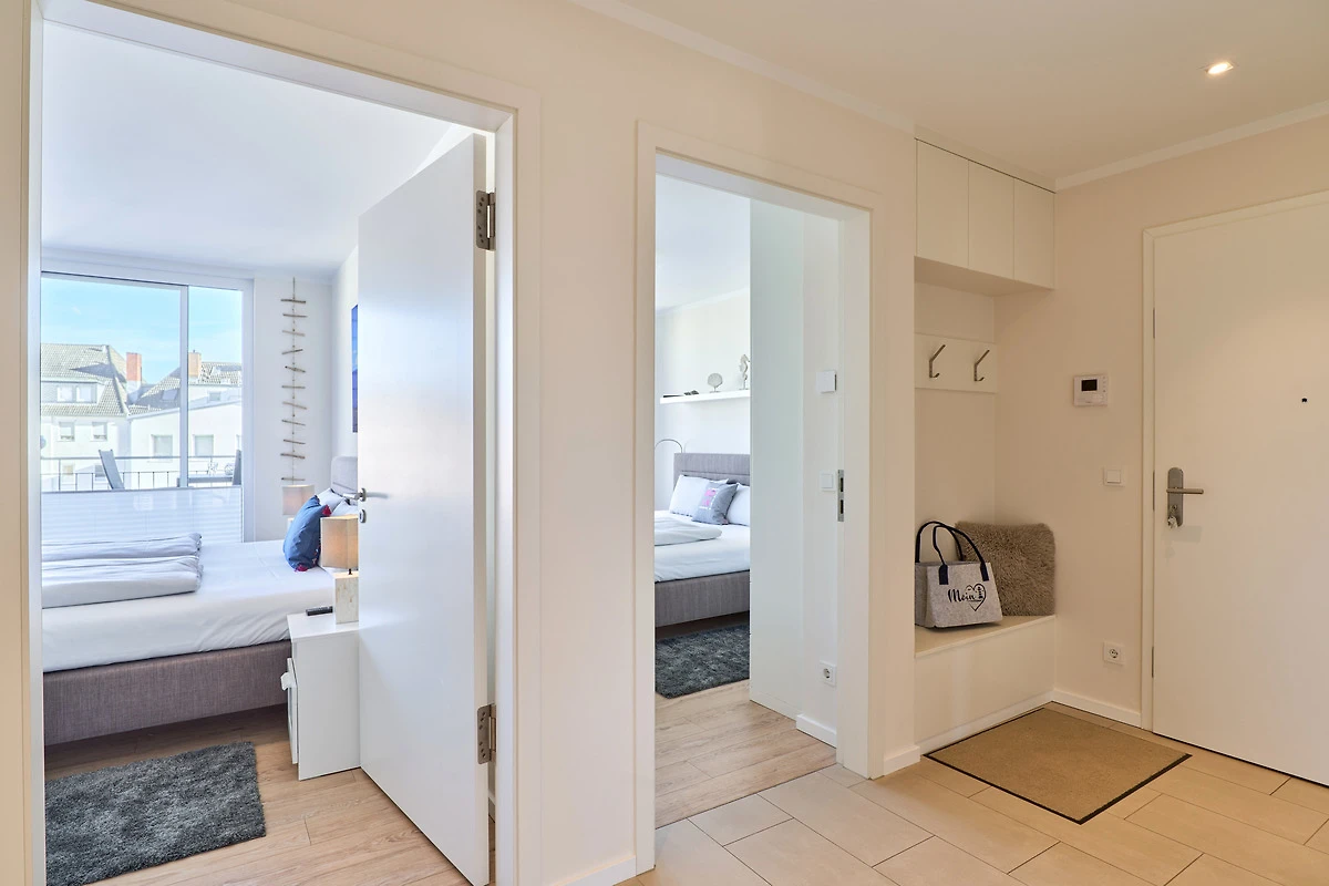 Helle und freundliche 3-Zimmer-Ferienwohnung mit zwei Balkonen im 2.OG, ca. 90 m², bequem mit dem Fahrstuhl zu erreichen, in der Hansastrasse 5a. Ca. 80 Meter vom Strand entfernt. 2 Schlafzimmer, 2 Bäder und Tiefgaragenstellplatz (Durchfahrtshöhe 2,08m).