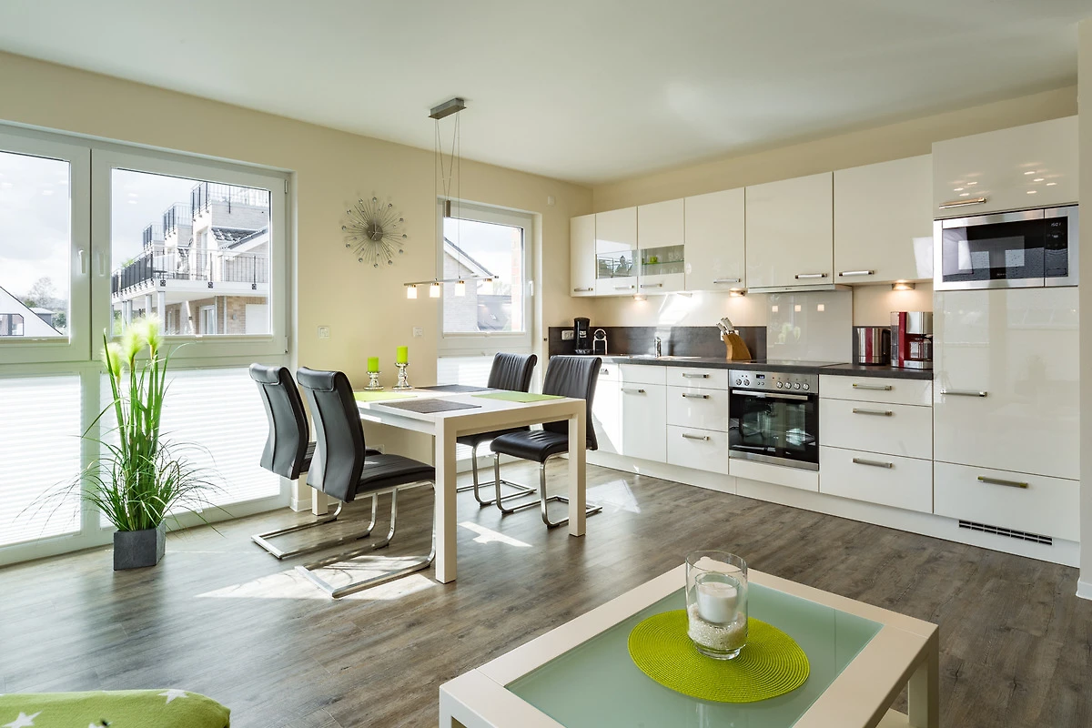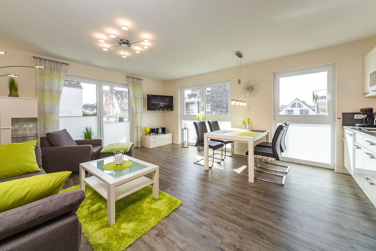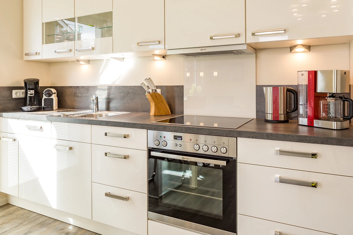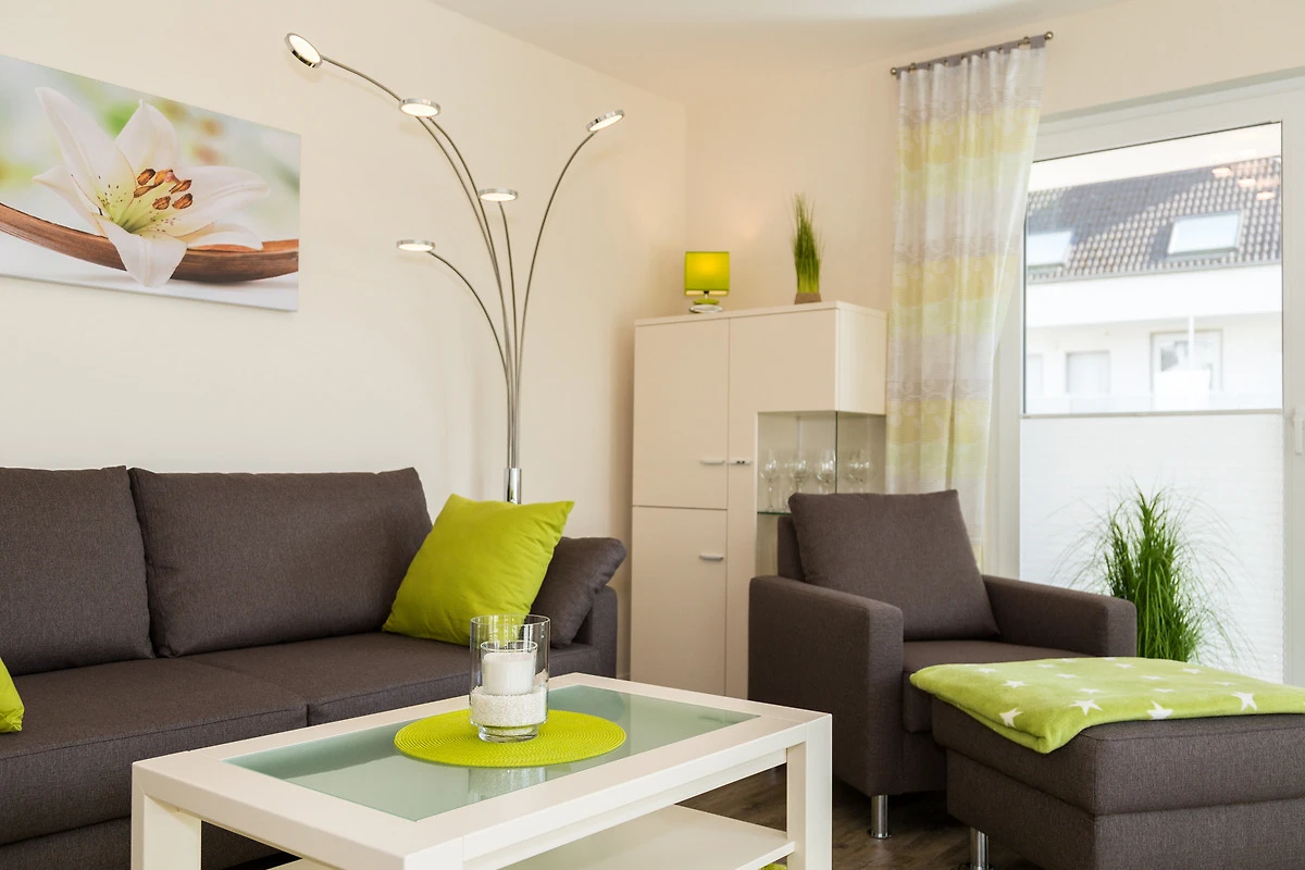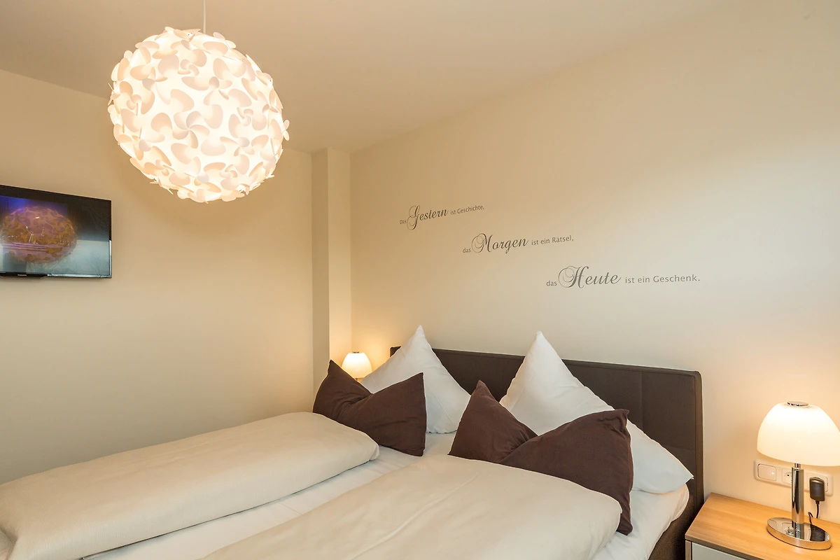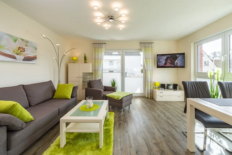 Diese schöne Ferienwohnung ist durchgehend mit einem Bodenbelag in Plankenoptik und Fussbodenheizung ausgestattet. Der Wohnraum verfügt über einen Essbereich sowie einen gemütlichen Sitzbereich. Die Couch lässt sich mit nur wenigen Handgriffen in eine bequeme Schlafcouch (1,80 x 2,00 m) umfunktionieren. Neben dem Flachbildfernseher und dem Blu-ray-Player steht Ihnen eine moderne HiFi-Anlage zur Verfügung. Kostenloses WLAN ist selbstverständlich und auch ein Telefon, mit dem Sie kostenfrei ins deutsche Festnetz (ausser Sonderrufnummern) telefonieren können, ist vorhanden. Der Balkon Richtung Süden ist mit einem hochwertigen Tisch und Stühlen ausgestattet. Die moderne Küche lässt keine Wünsche offen. Neben einer Filterkaffeemaschine stehen zusätzlich eine Nespresso-Kapselmaschine und eine Senseo-Maschine für Sie bereit. Das Schlafzimmer ist mit einem geräumigen Schrank, einem komfortablen Boxspringbett (1,80 x 2,00 m) sowie einem Flachbildfernseher ausgestattet. Im modernen Tageslichtbad befinden sich zusätzlich ein Handtuchheizkörper und eine Waschmaschine. Eine bodengleiche Dusche mit Regenduschkopf und ein Radio machen dieses Bad komplett.