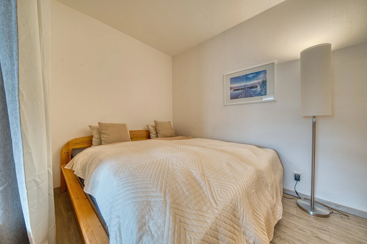 Wohn-/Schlafbereich mit Doppelbett (180x200 cm), durch Vorhang optisch separiert