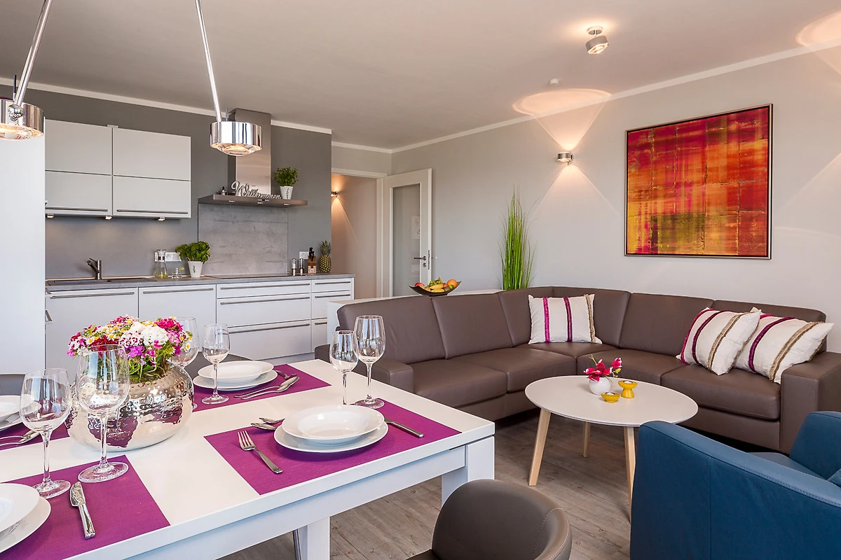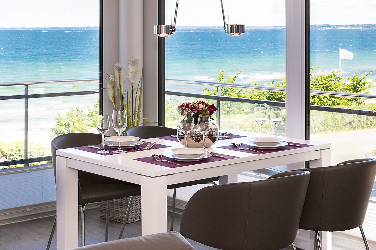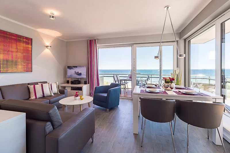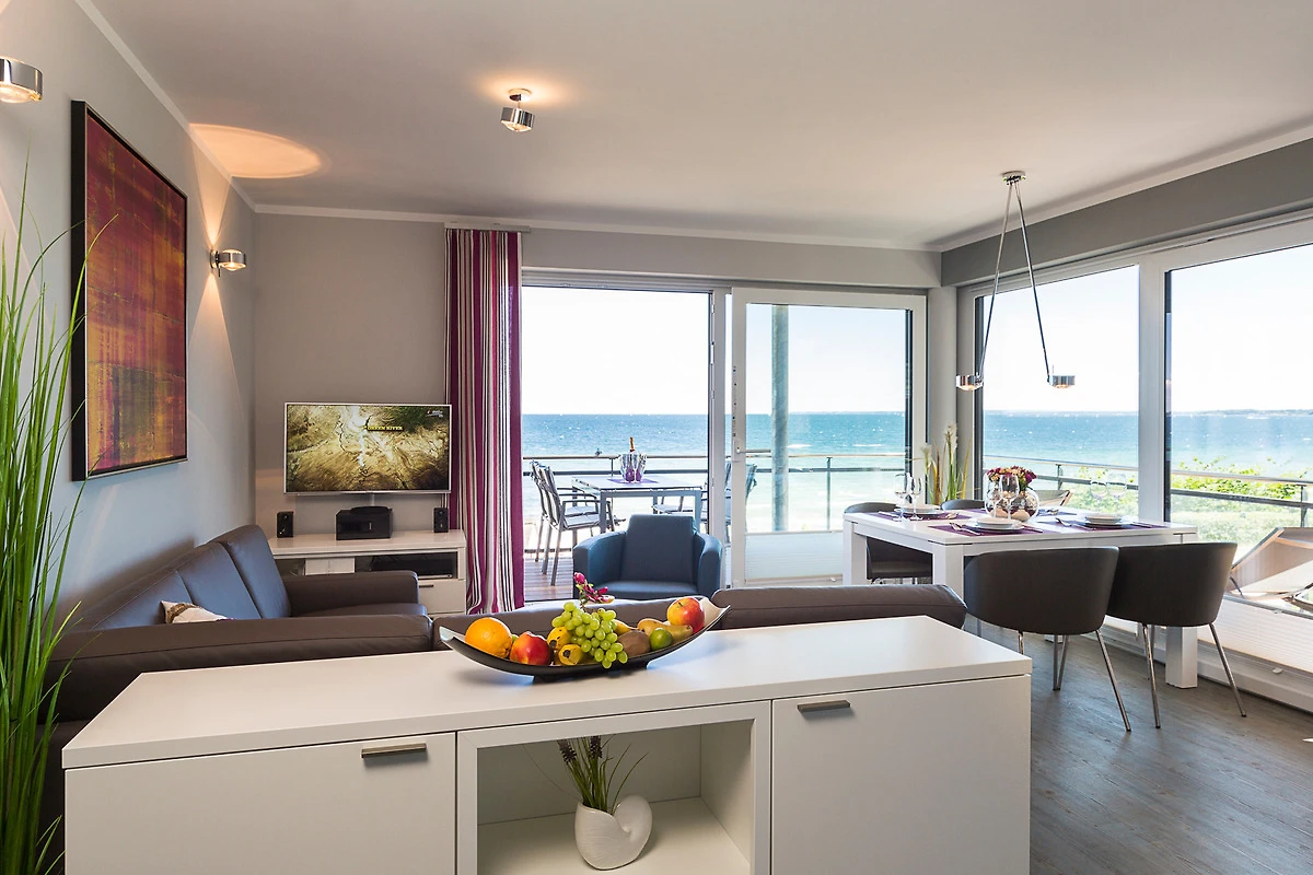 Bereits beim Betreten der Wohnung können Sie vom Flur aus auf die Ostsee schauen. Auch alle weiteren Räume bieten Ihnen einen herrlichen Blick auf die Ostsee. Der Eingangsbereich ist mit einer bequemen Garderobenbank und –panel sowie einem grossen Schuhschrank ausgestattet. Der Wohnbereich ist grosszügig eingerichtet und durch die bodentiefen Fenster mit Südausrichtung sehr hell. Ein Sicht- bzw. Lichtschutz ist ebenso vorhanden wie elektrische Rollläden. Von der sehr komfortablen Leder-Eckcouch[nbsp] können Sie den herrlichen Meerblick geniessen. Ein grosser Tisch mit vier bequemen Schalenstühlen bietet ausreichend Platz. Ein drehbarer Flachbildschirm mit Heimkino-Anlage inklusive Blu-ray-Player lässt keine Wünsche offen. Per Smartphone direkt via Bluetooth verbinden und eigene Musik hören oder auch nur das Radio einschalten. Der Wohnbereich wird geschickt durch ein Sideboard von der Küche optisch getrennt. Die offene Designerküche mit weisser Mattlackoberfläche ist mit hochwertigen Elektrogeräten von Siemens ausgestattet: Induktionsherd, Backofen mit integrierter Mikrowelle, Geschirrspüler, Kühl-/Gefrierkombination, Wasserkocher, Toaster, Filter- und Kapsel-Kaffeemaschine.