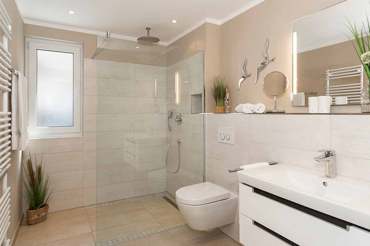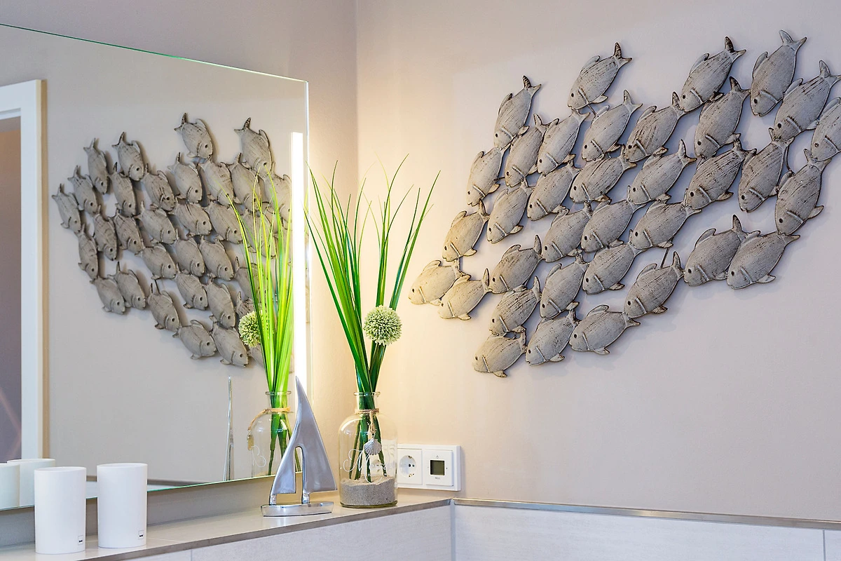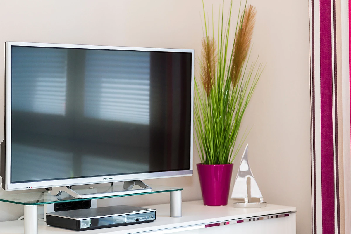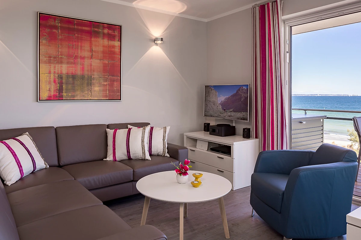 Bereits beim Betreten der Wohnung können Sie vom Flur aus auf die Ostsee schauen. Auch alle weiteren Räume bieten Ihnen einen herrlichen Blick auf die Ostsee. Der Eingangsbereich ist mit einer bequemen Garderobenbank und –panel sowie einem grossen Schuhschrank ausgestattet. Der Wohnbereich ist grosszügig eingerichtet und durch die bodentiefen Fenster mit Südausrichtung sehr hell. Ein Sicht- bzw. Lichtschutz ist ebenso vorhanden wie elektrische Rollläden. Von der sehr komfortablen Leder-Eckcouch[nbsp] können Sie den herrlichen Meerblick geniessen. Ein grosser Tisch mit vier bequemen Schalenstühlen bietet ausreichend Platz. Ein drehbarer Flachbildschirm mit Heimkino-Anlage inklusive Blu-ray-Player lässt keine Wünsche offen. Per Smartphone direkt via Bluetooth verbinden und eigene Musik hören oder auch nur das Radio einschalten. Der Wohnbereich wird geschickt durch ein Sideboard von der Küche optisch getrennt. Die offene Designerküche mit weisser Mattlackoberfläche ist mit hochwertigen Elektrogeräten von Siemens ausgestattet: Induktionsherd, Backofen mit integrierter Mikrowelle, Geschirrspüler, Kühl-/Gefrierkombination, Wasserkocher, Toaster, Filter- und Kapsel-Kaffeemaschine.