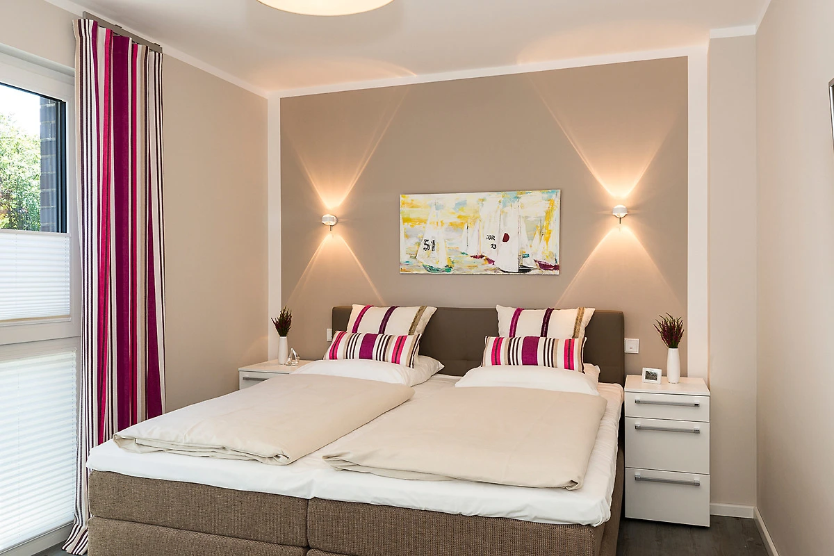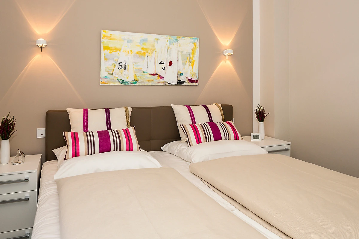 Die beiden Tageslichtbäder mit hellen, sandfarbenen Fliesen sind mit einer bodengleichen Dusche (Regenkopf- und Handbrause), jeweils einem Waschtisch mit Unterschrank von Villeroy und Boch, je zwei Handtuchhaltern, Handtuchheizkörper, Fussbodenheizung, Föhn, Kosmetikspiegel und jeweils einem Leuchtspiegel von Zierath sehr schön ausgestattet. Ein Radio von Busch Jaeger, verbunden mit eingebauten Deckenlautsprechern, sorgt für ein angenehmes Musikerlebnis. Die beiden Schlafzimmer verfügen über gemütliche Boxspringbetten (180 x 200m) der Marke Vito, einen Kleiderschrank mit Schiebetüren von Hülsta (Innenschubkästen, Einlegeböden, Kleiderstange), zwei Nachtkonsolen von Hülsta und einen Flachbildschirm von Panasonic. Ein Sicht- bzw. Lichtschutz ist ebenso vorhanden wie elektrische Rollläden. Der Balkon mit optimaler Süd-/Ostausrichtung begrüsst seine Gäste bereits zum Frühstück mit einem Platz an der Sonne. Ein grosser Tisch mit vier Stühlen aus hochwertigem Aluminium lädt zu gemütlichen Stunden ein. Auf einer Rollenliege kann zusätzlich entspannt werden. In einer grossen Stauraumkiste können nicht nur ihre Koffer platzsparend aufbewahrt werden, hier finden Sie auch Auflagen für Liege und Sessel. Ein grosser, höhenverstellbarer Sonnenschirm rundet das Angebot auf dem Balkon ab. Wir freuen uns auf Sie!